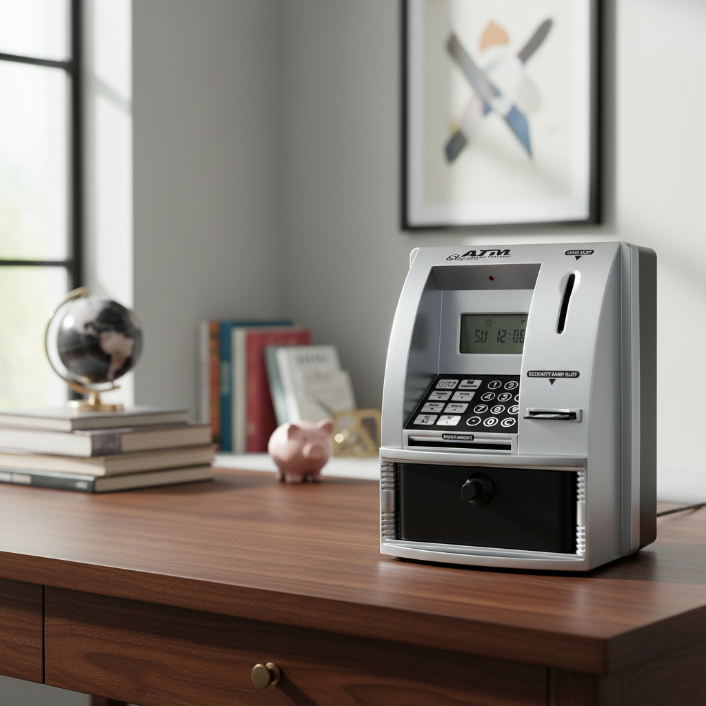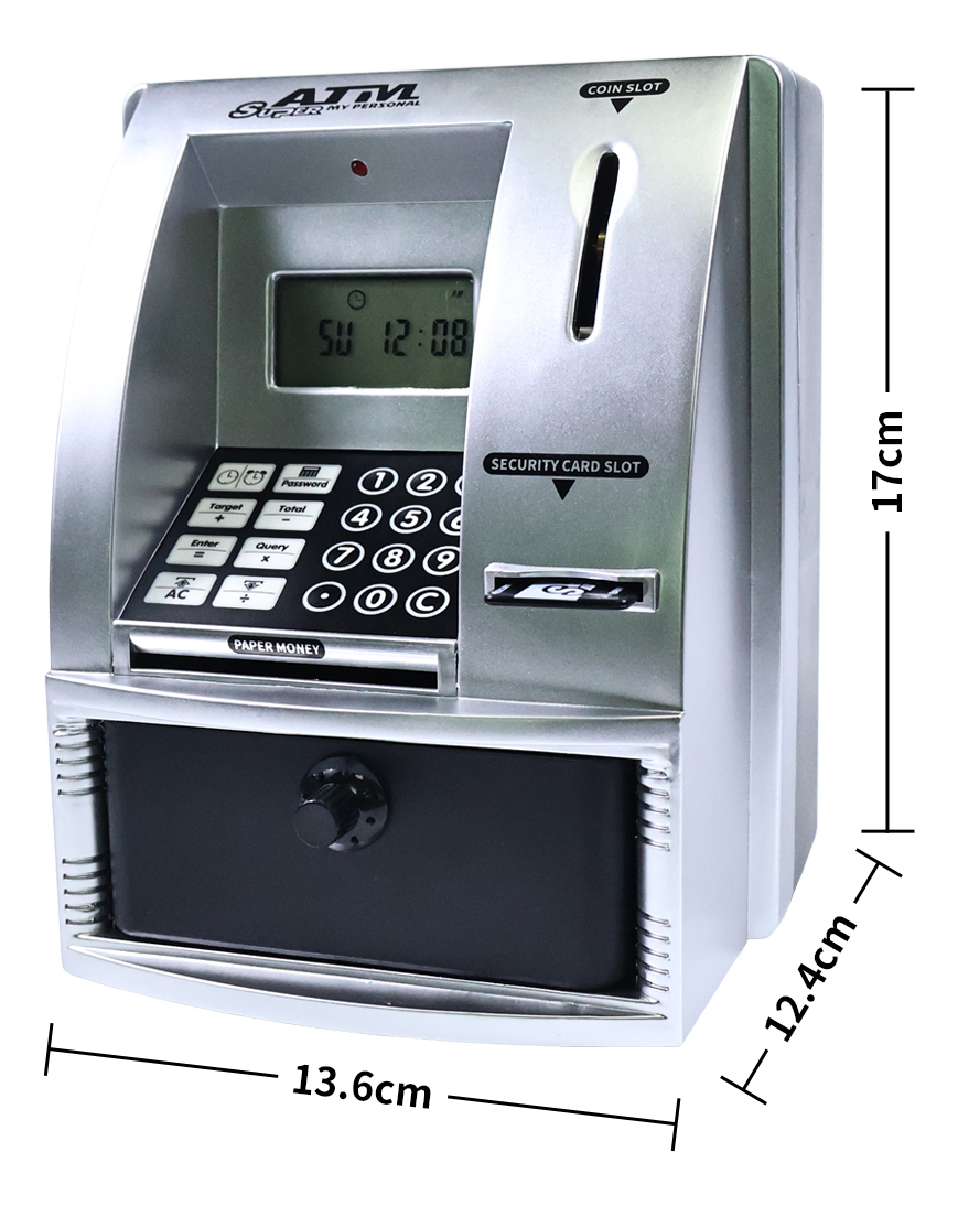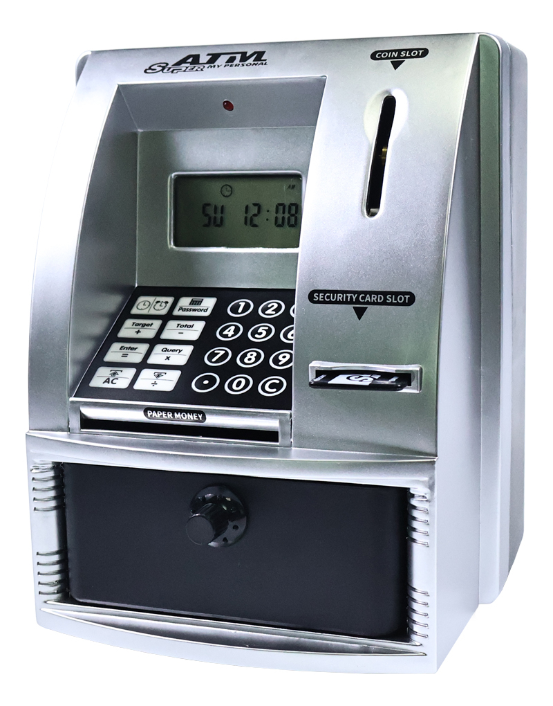 Convertí el ahorro en un juego divertido con esta alcancía infantil con forma de cajero automático. Los niños pueden usar su propia tarjeta de seguridad, ingresar clave, depositar monedas y billetes, ver el saldo en pantalla y administrar sus ahorros como si fuera un ATM real.