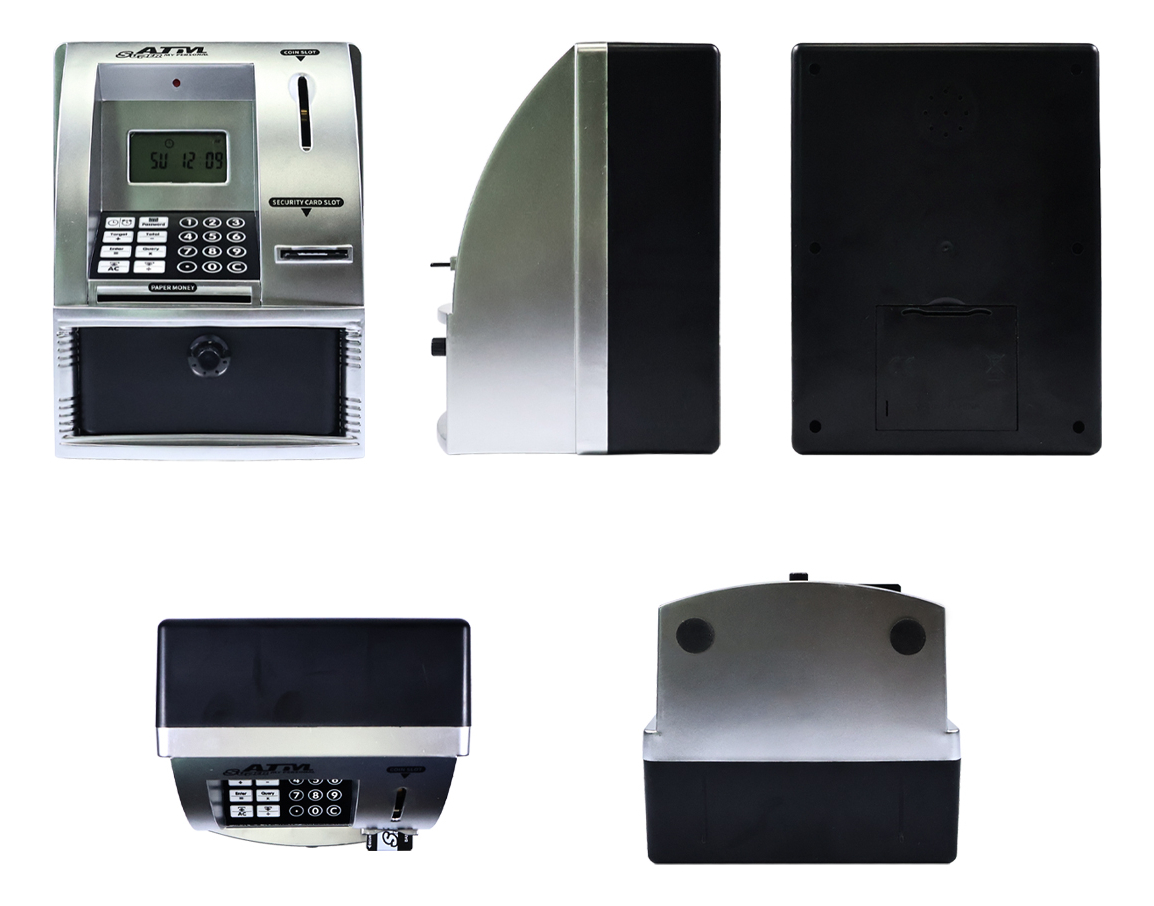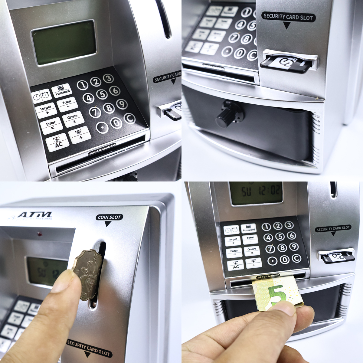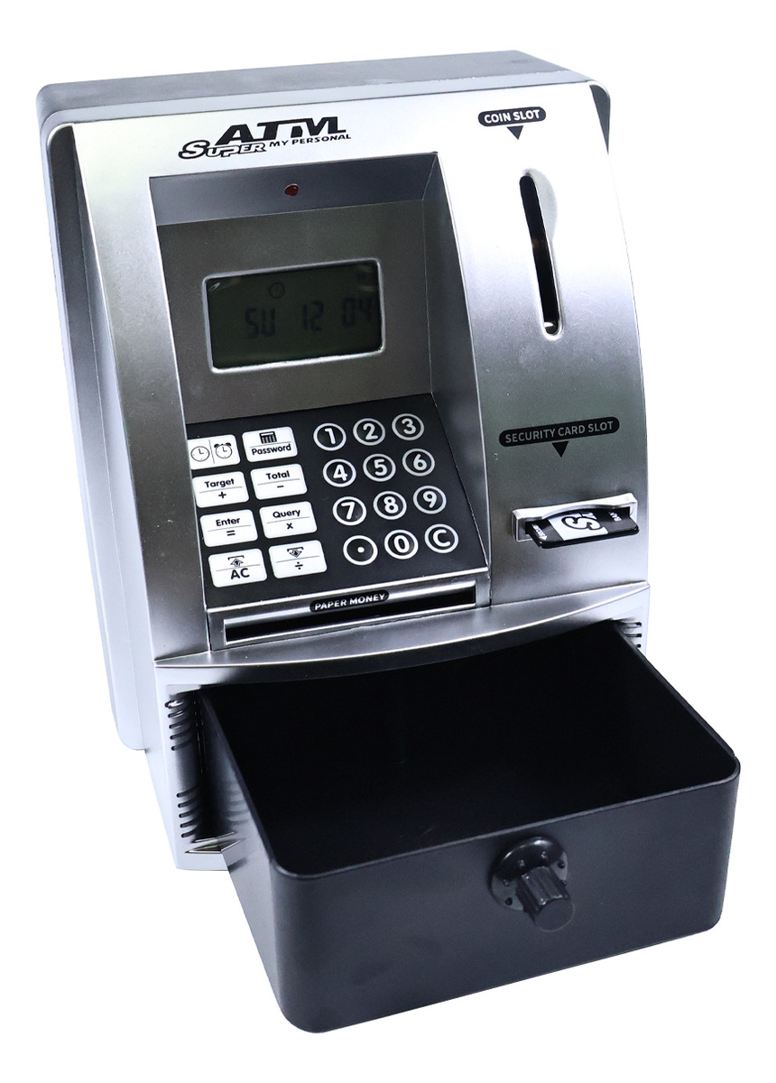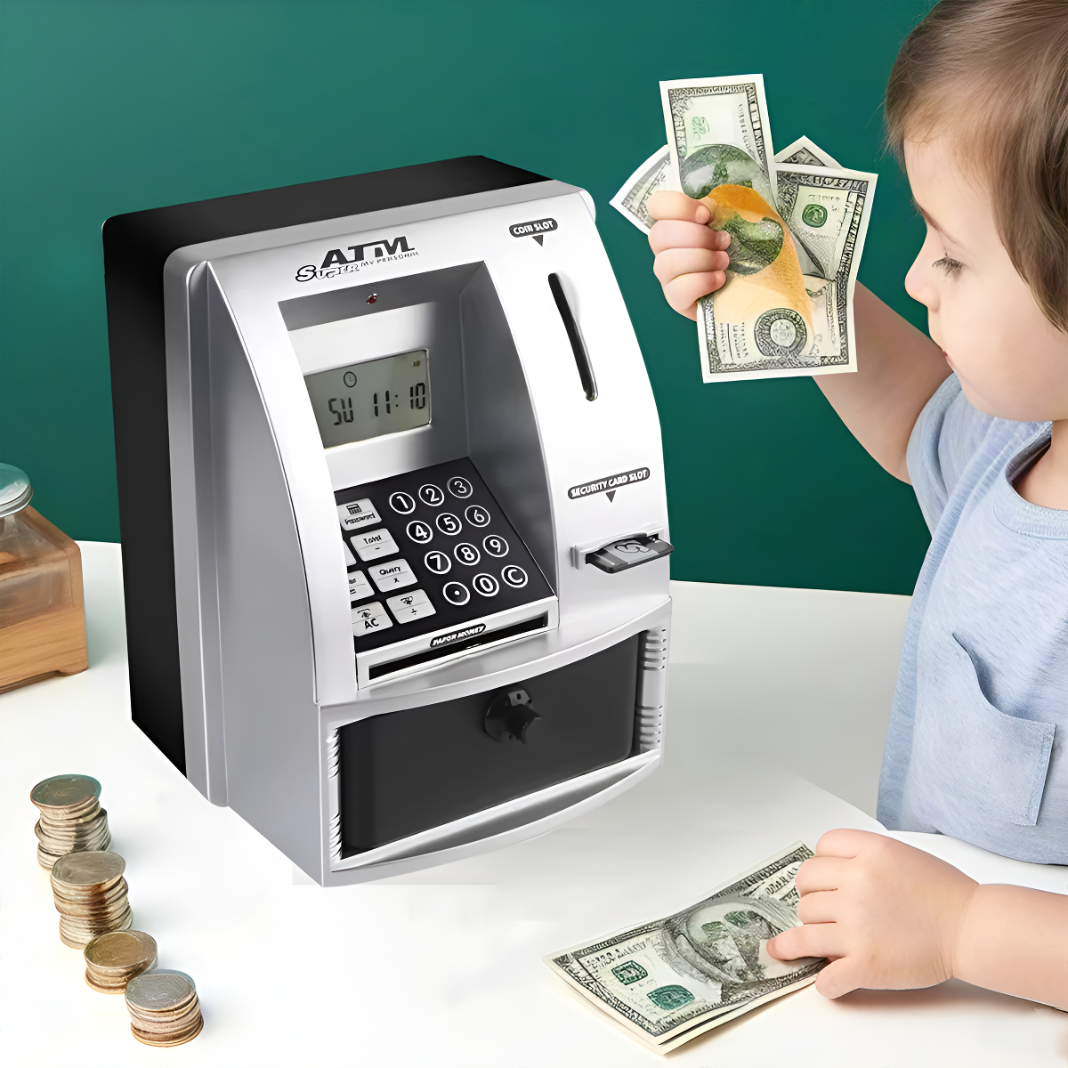 Convertí el ahorro en un juego divertido con esta alcancía infantil con forma de cajero automático. Los niños pueden usar su propia tarjeta de seguridad, ingresar clave, depositar monedas y billetes, ver el saldo en pantalla y administrar sus ahorros como si fuera un ATM real.