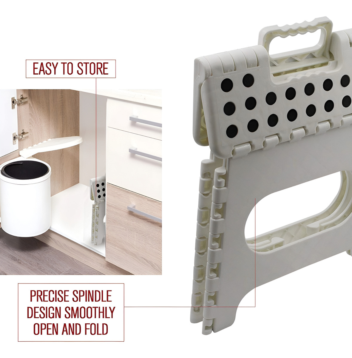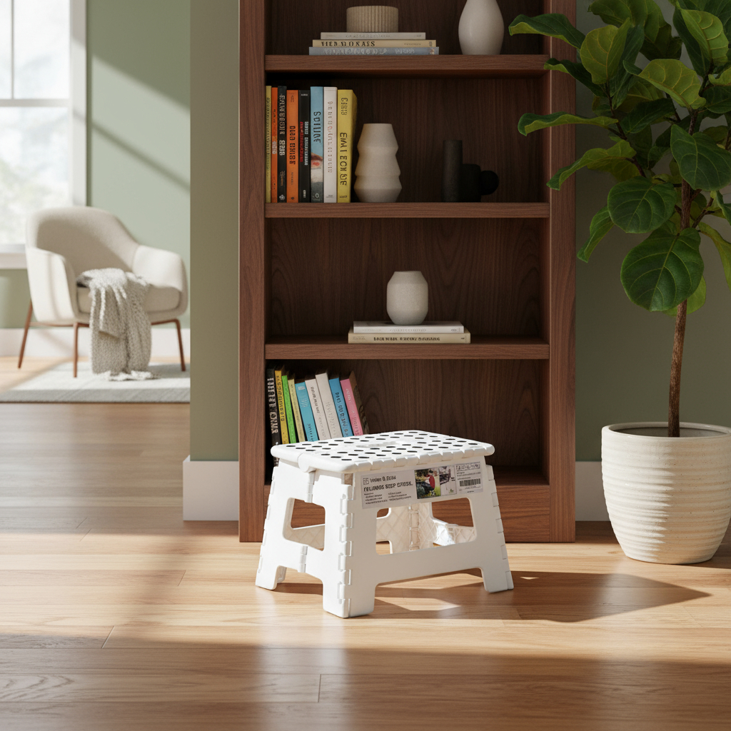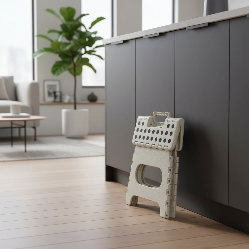 Su diseño compacto y plegable permite guardarlo fácilmente sin ocupar espacio, mientras que su superficie antideslizante y patas estables brindan seguridad en cada uso.