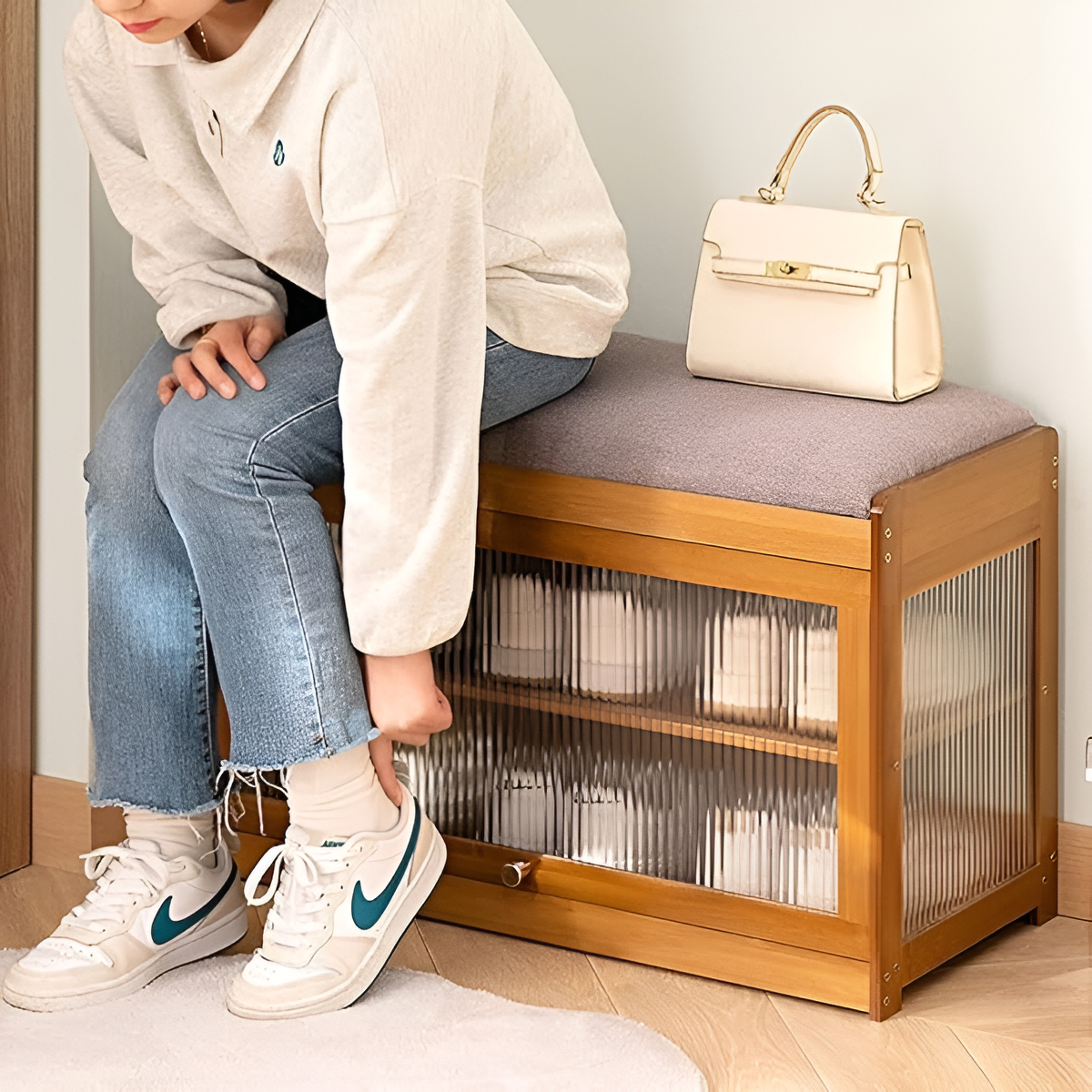 Cuenta con puertas de acrílico texturizado que ocultan el interior sin bloquear la luz, manteniendo tus ambientes ordenados y visualmente limpios. Su estructura firme y su asiento acolchonado ofrecen soporte al calzarte o descansar.