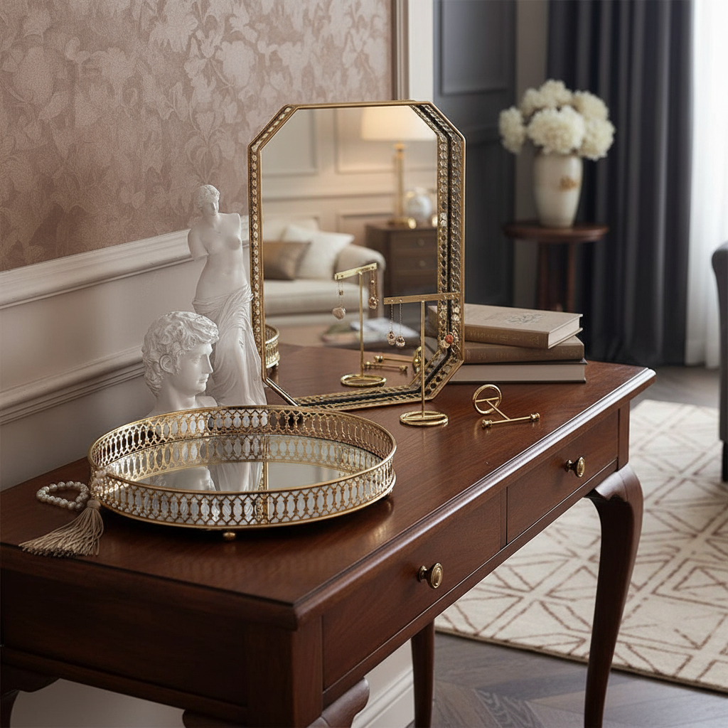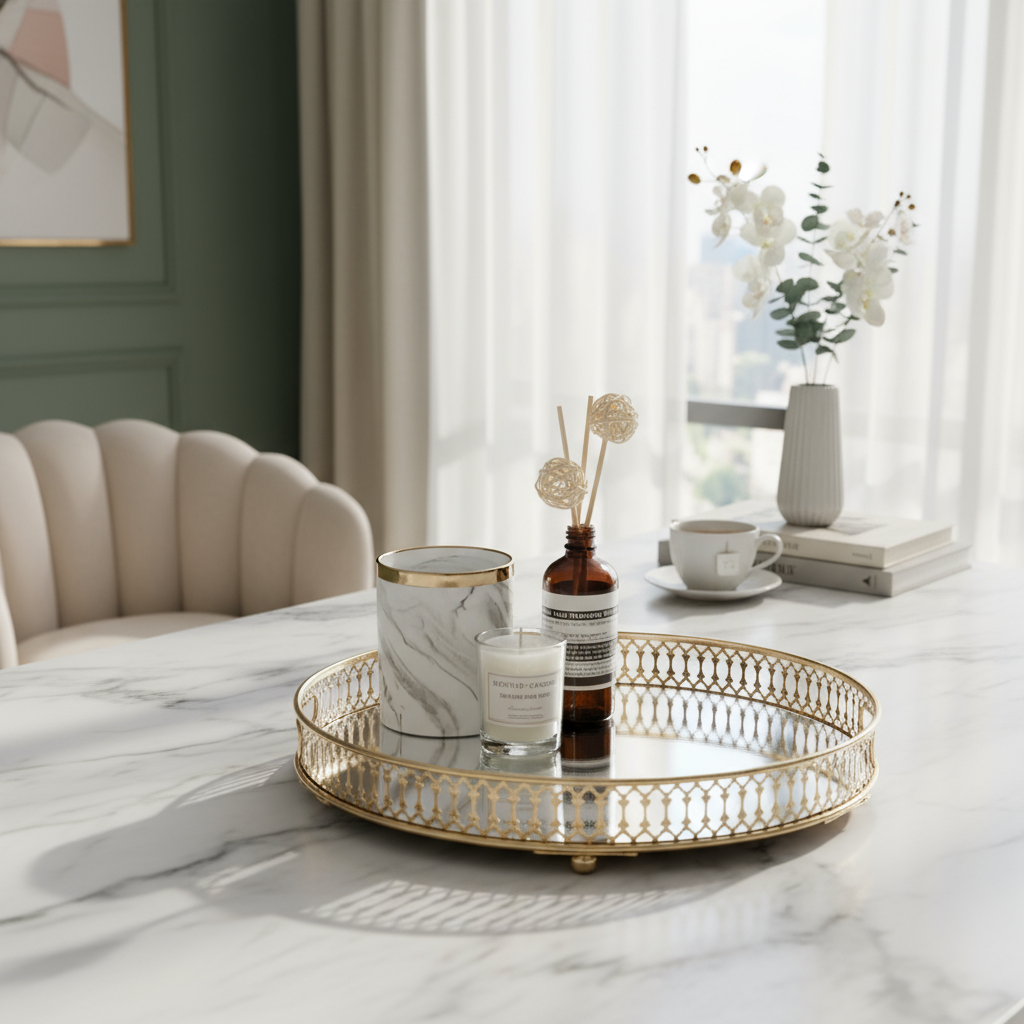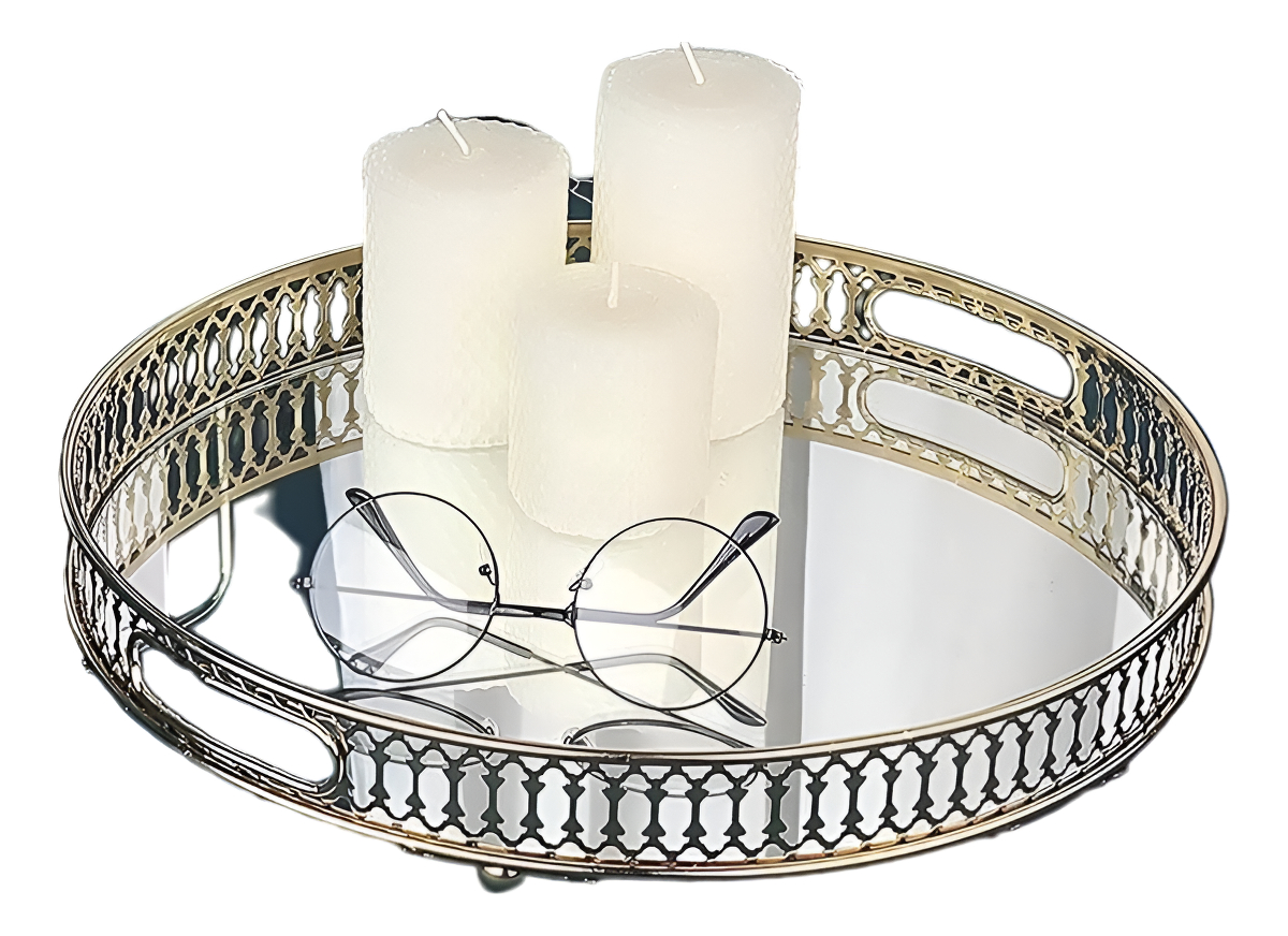 Esta bandeja circular dorada con base espejada es el complemento perfecto para organizar y decorar tus espacios. Su diseño nórdico elegante la convierte en una pieza versátil que combina funcionalidad y estilo, ideal para destacar objetos en tu hogar.