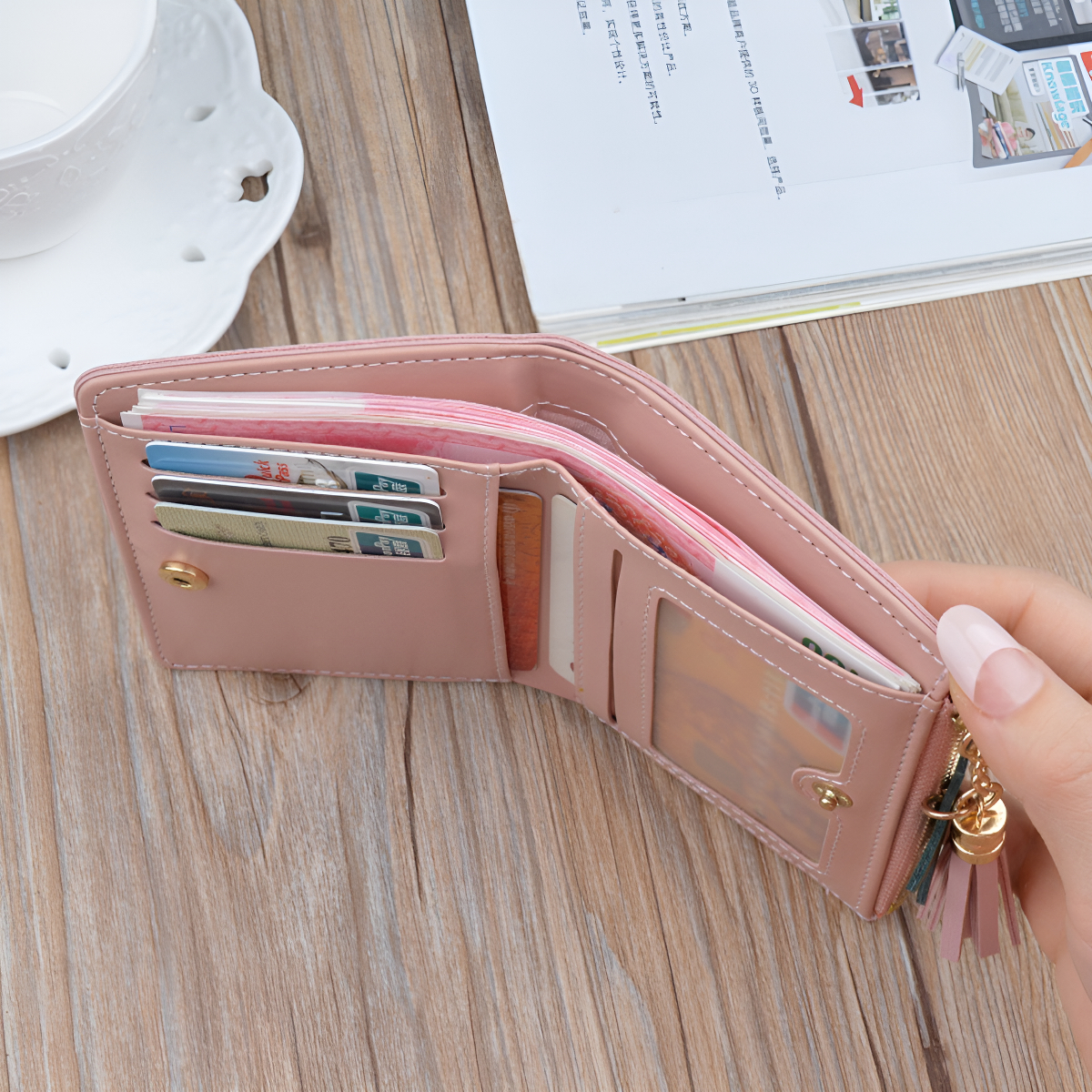 Organizá tus esenciales con esta billetera de dama en cuero PU con diseño geométrico. Compacta y elegante, ofrece el espacio justo para tarjetas, billetes y monedas, con un llavero decorativo de borla y aplique para darle un toque distintivo.