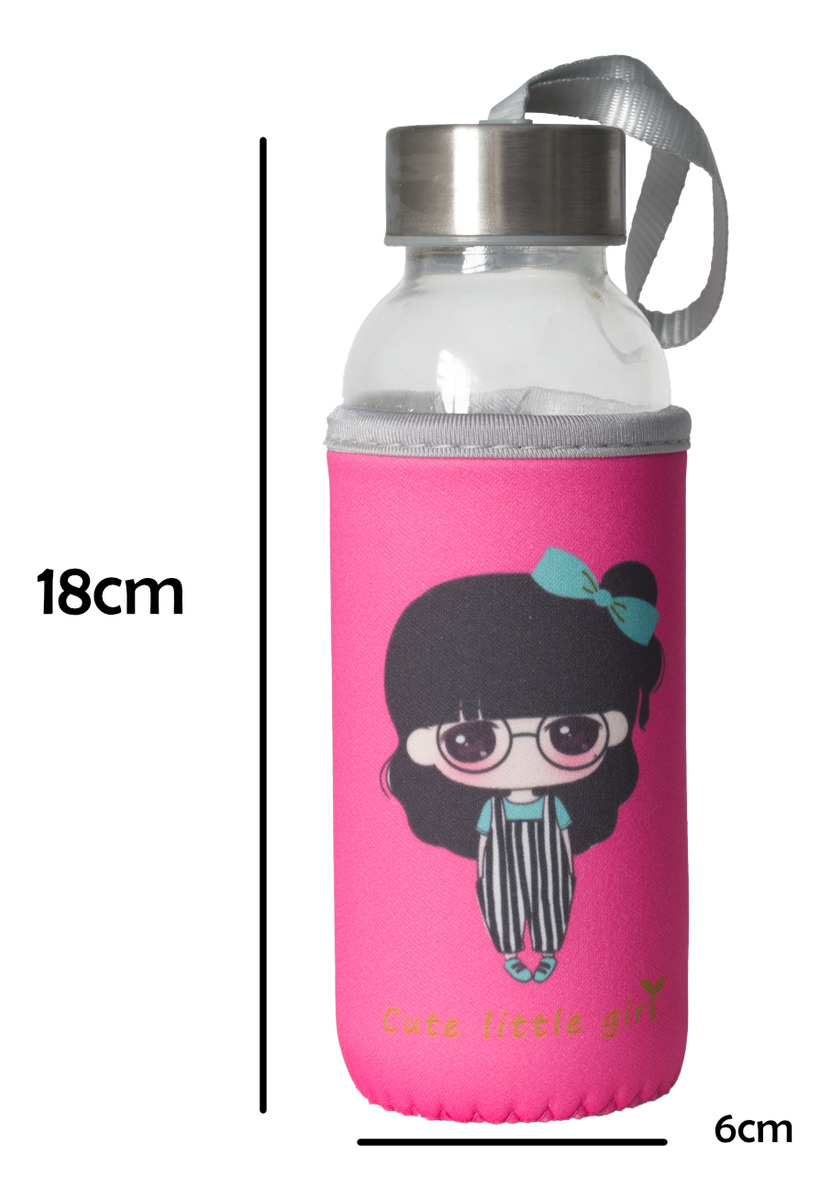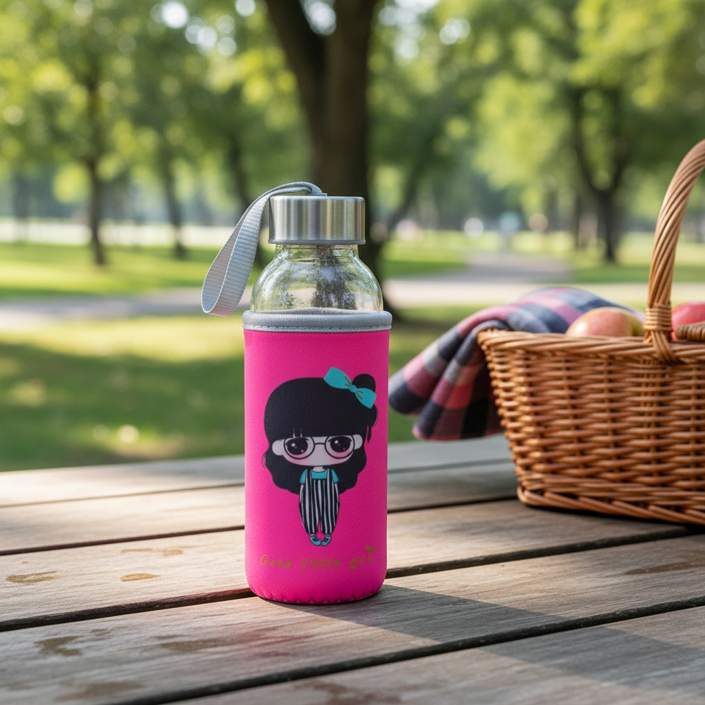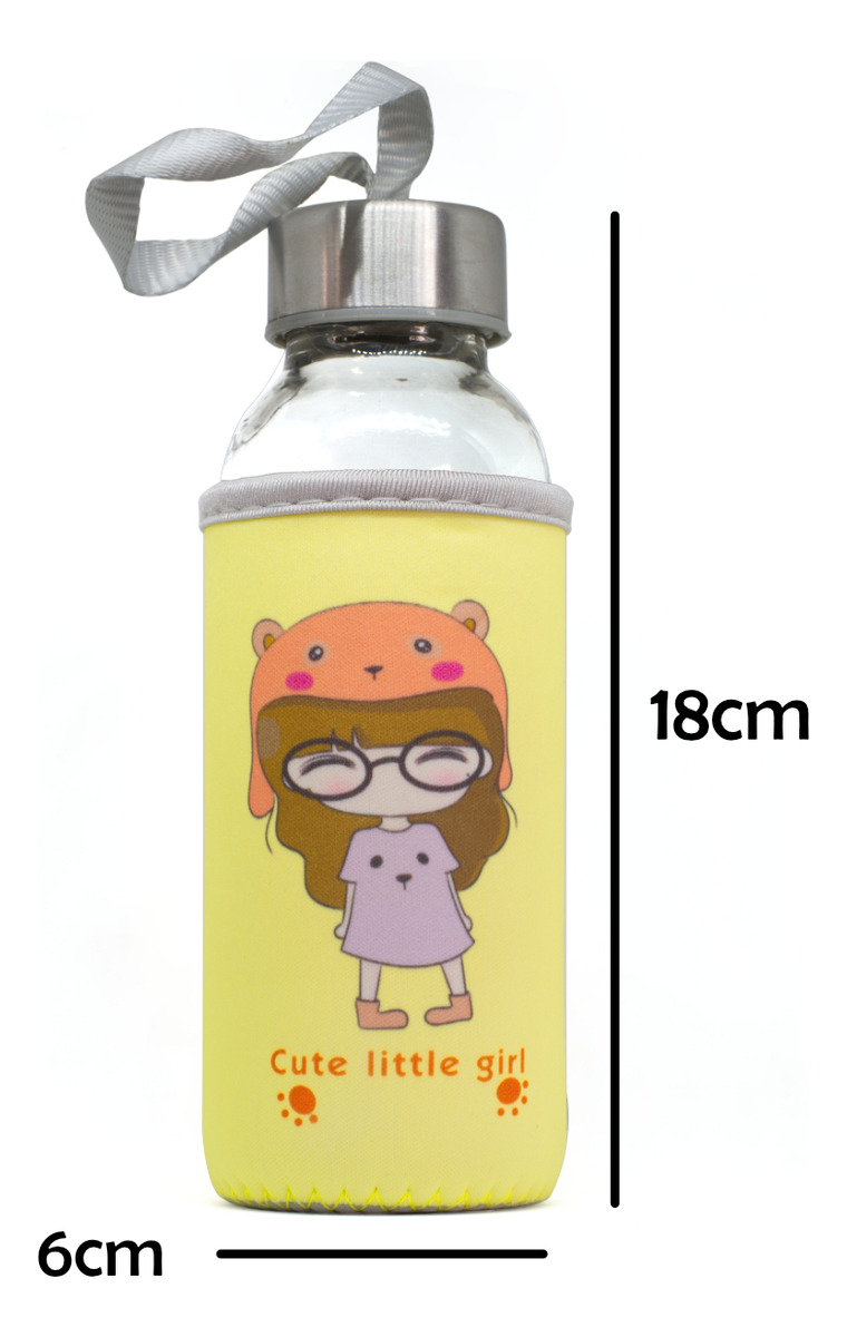 Hidratate con estilo y practicidad con esta botella de vidrio con funda de neopreno. Su diseño divertido la convierte en la compañera ideal para la escuela, el parque o cualquier salida, mientras que su tamaño compacto es perfecto para los más chicos.