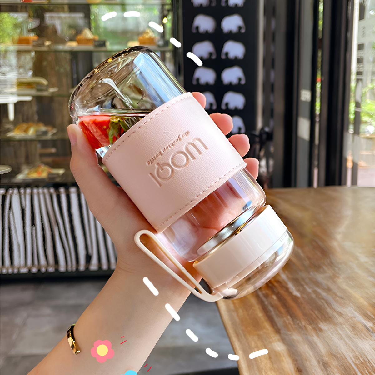 Disfrutá tus bebidas favoritas con esta botella de vidrio reutilizable con filtro de acero inoxidable. Su diseño práctico y elegante la convierte en el accesorio ideal para hidratarte en el trabajo, en el gimnasio o durante tus actividades diarias.