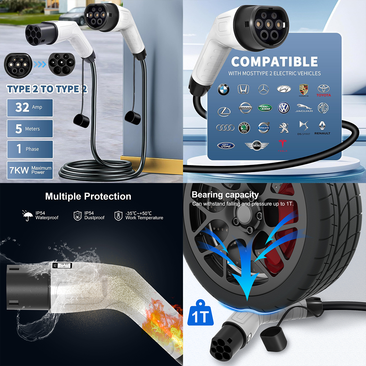 Conectá tu auto eléctrico en casa, oficina o puntos públicos con este cable de carga Tipo 2 a Tipo 2. Con alcance de 5 metros y capacidad 7 kW (32 A, monofásico), es ideal para carga AC Modo 3 en wallbox y estaciones sin cable incorporado.