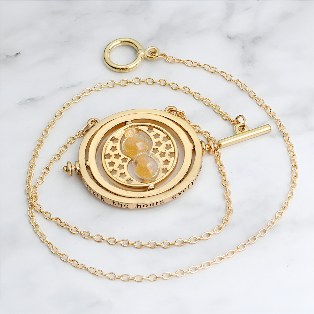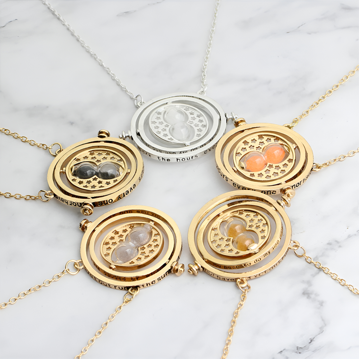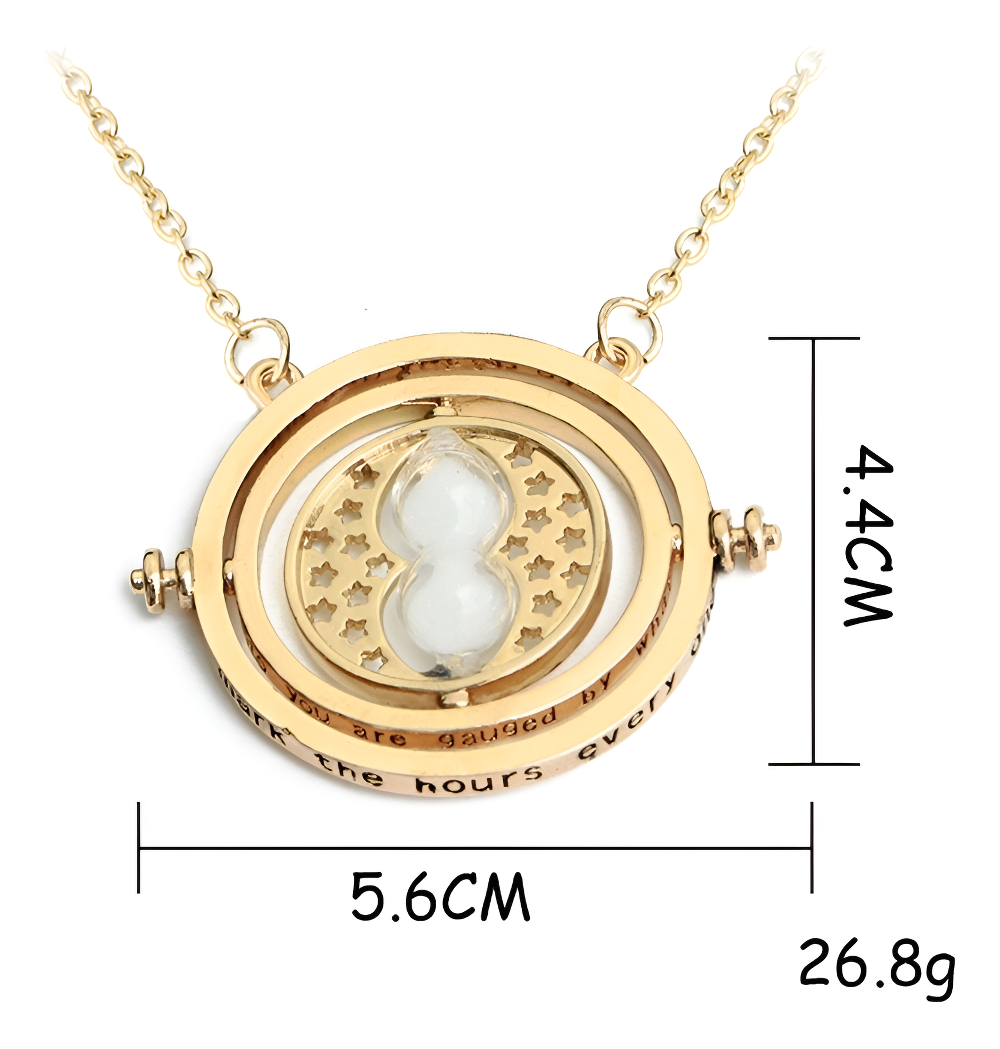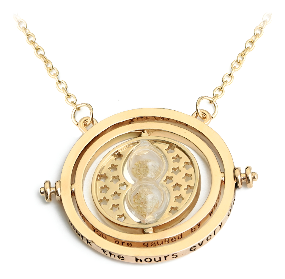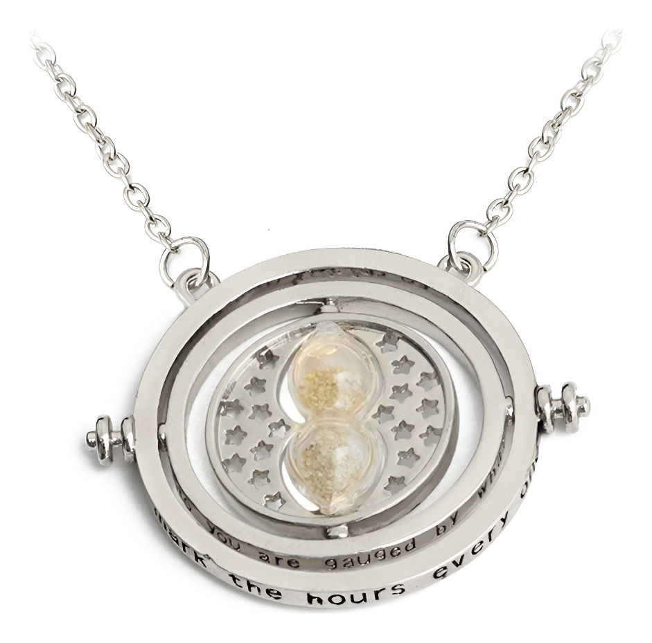 Dale un toque mágico a tu estilo con este collar giratiempos, inspirado en la saga más querida. Su dije con anillos giratorios y mini reloj de arena lo convierte en una pieza llamativa para uso diario o para regalar.