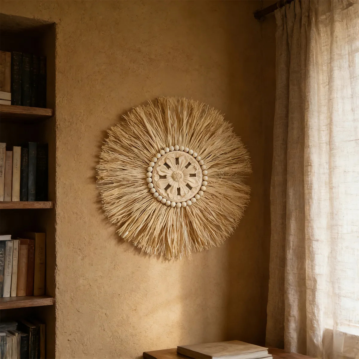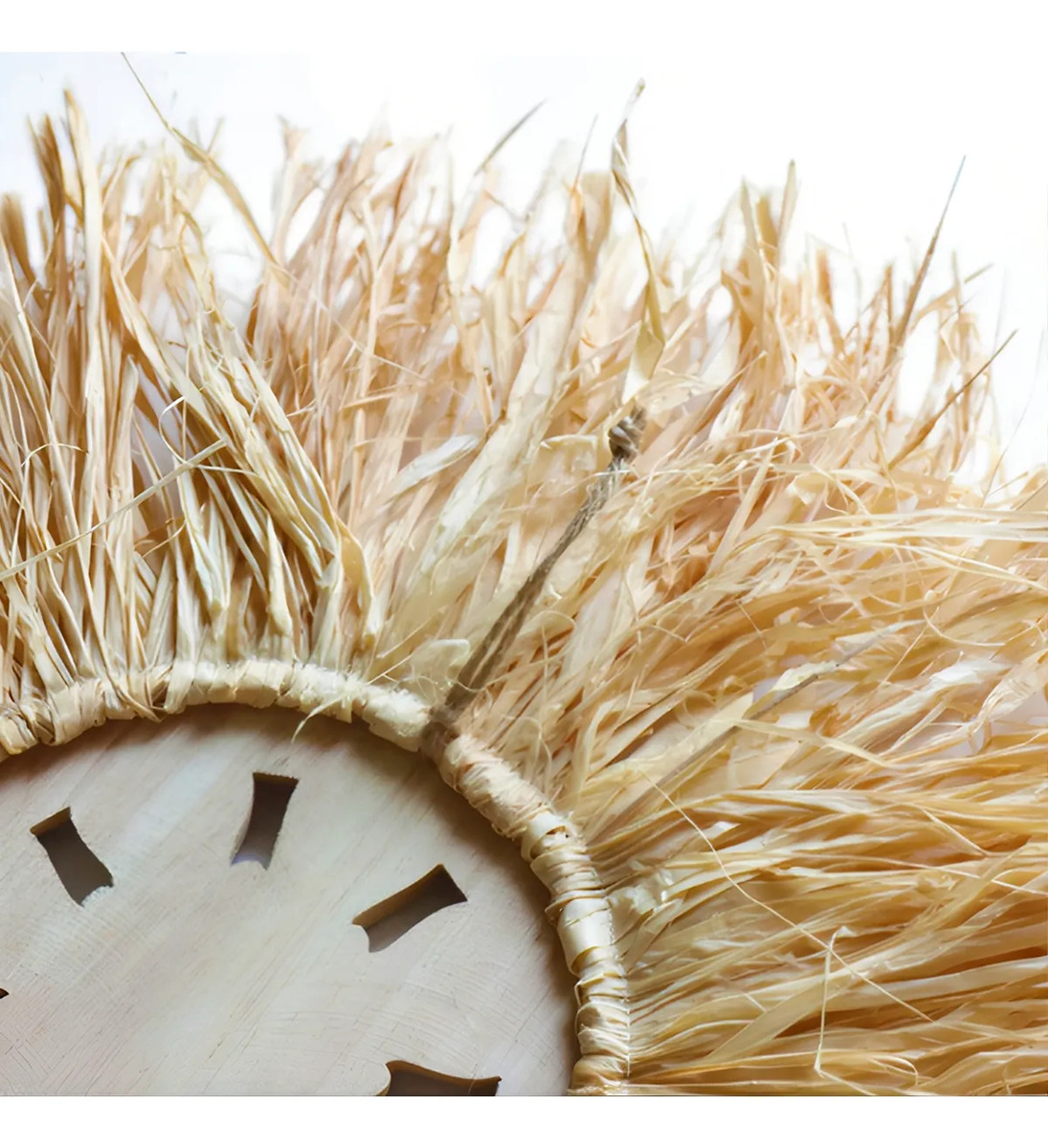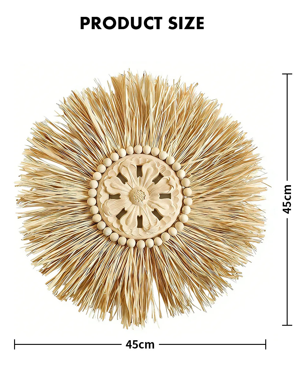 Elegante decoración de pared en estilo boho, confeccionada con fibras naturales y un centro artesanal tallado. Su diseño circular y textura orgánica la convierten en una pieza ideal para aportar calidez, estilo y personalidad a cualquier ambiente. Perfecta para livings, dormitorios o espacios creativos que busquen una estética natural y relajada.