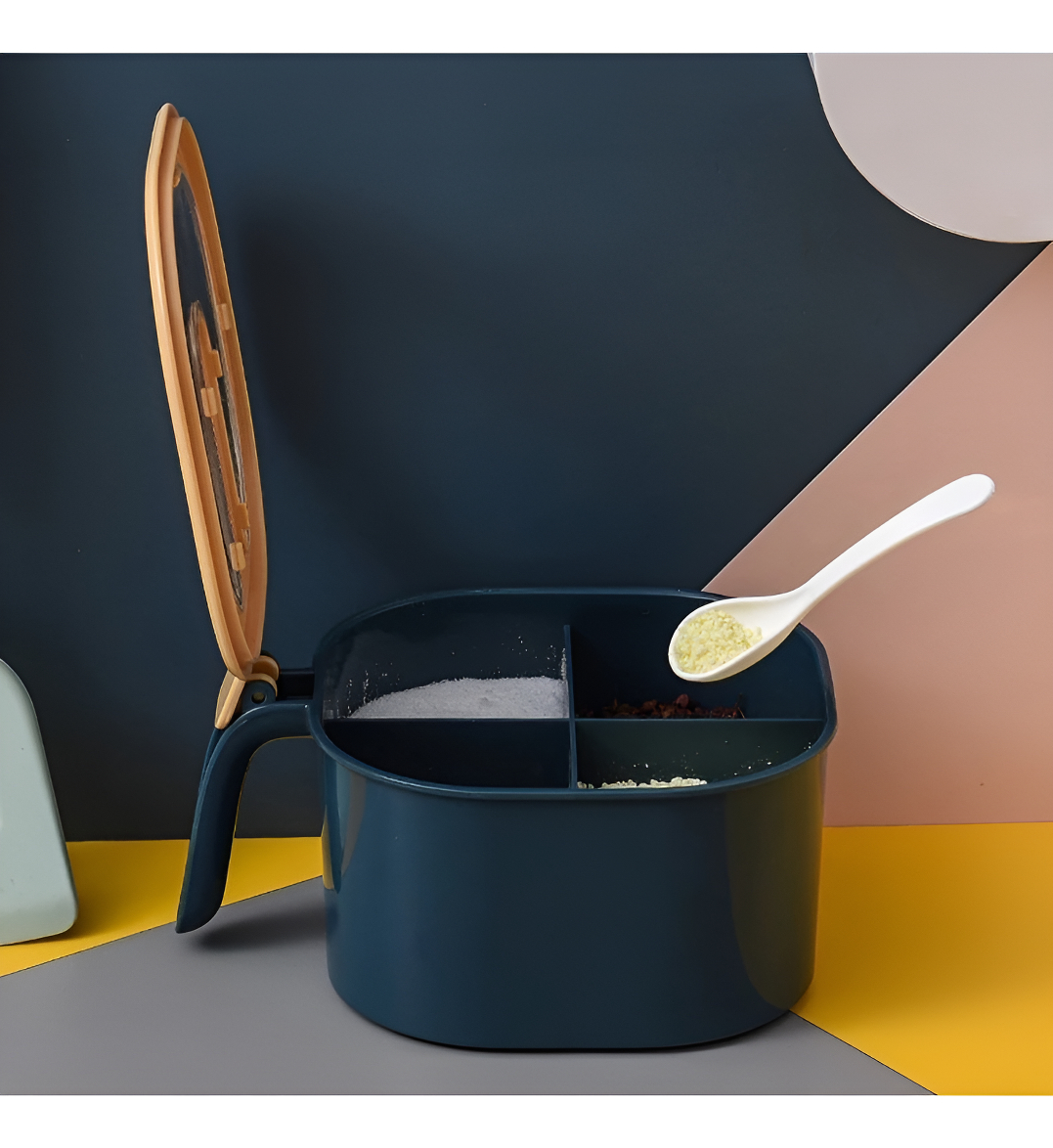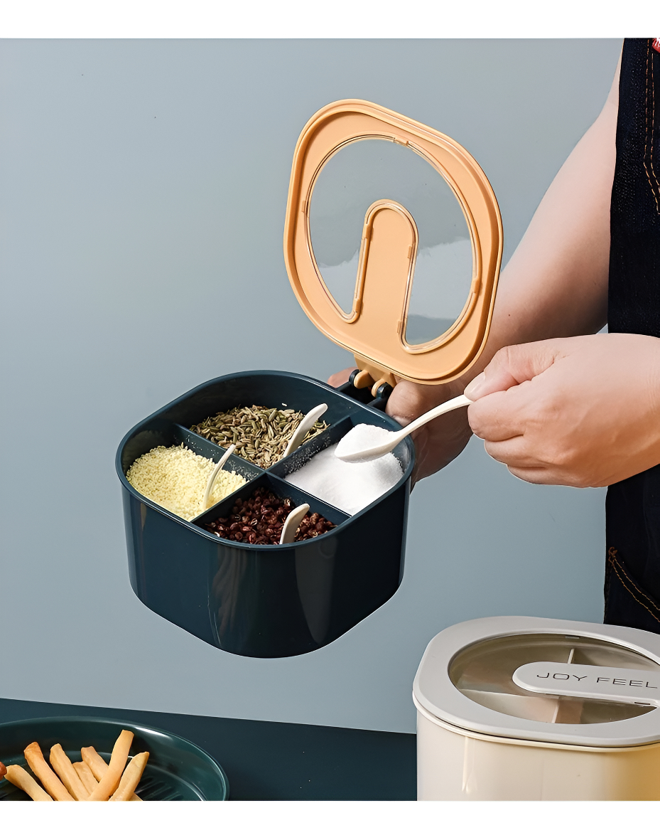 – Ahorro de espacio: 4 compartimentos en un mismo especiero, perfecto para sal, azúcar, café, hierbas y especias.