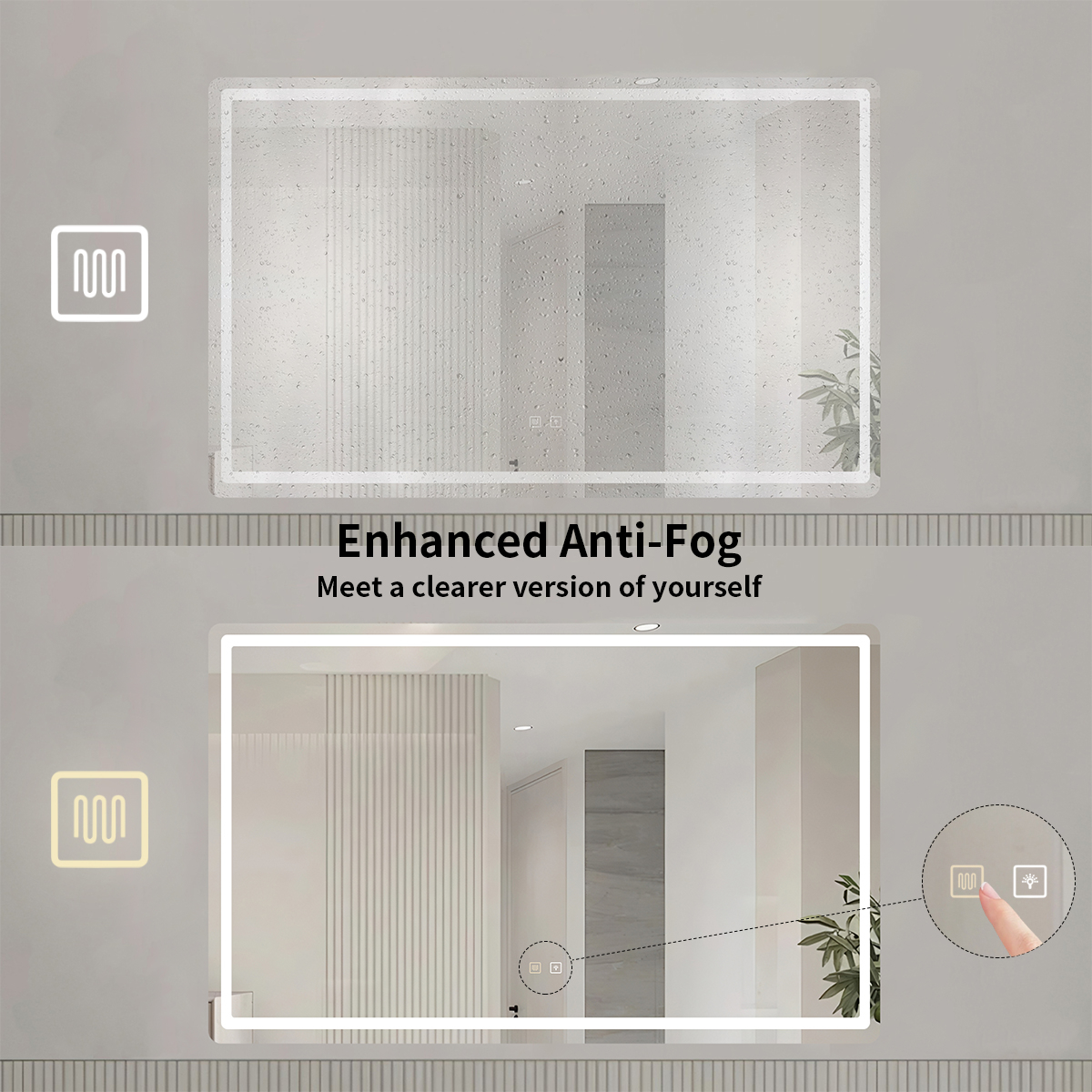 Gracias a su sistema desempañador integrado, el espejo se mantiene siempre limpio y claro, incluso después de duchas calientes, evitando esperas y mejorando tu experiencia diaria.