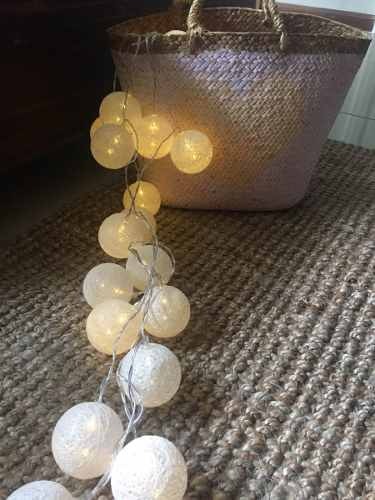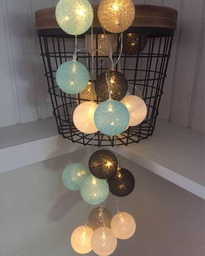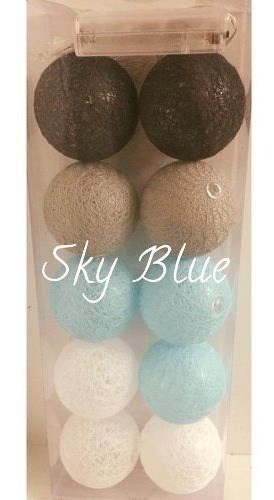 La guía es de 10 esferas plástica de hilo color azul celeste y blanco, mide 1,75 aprox. y su funcionamiento es a pila (no incluidas), luz cálida.