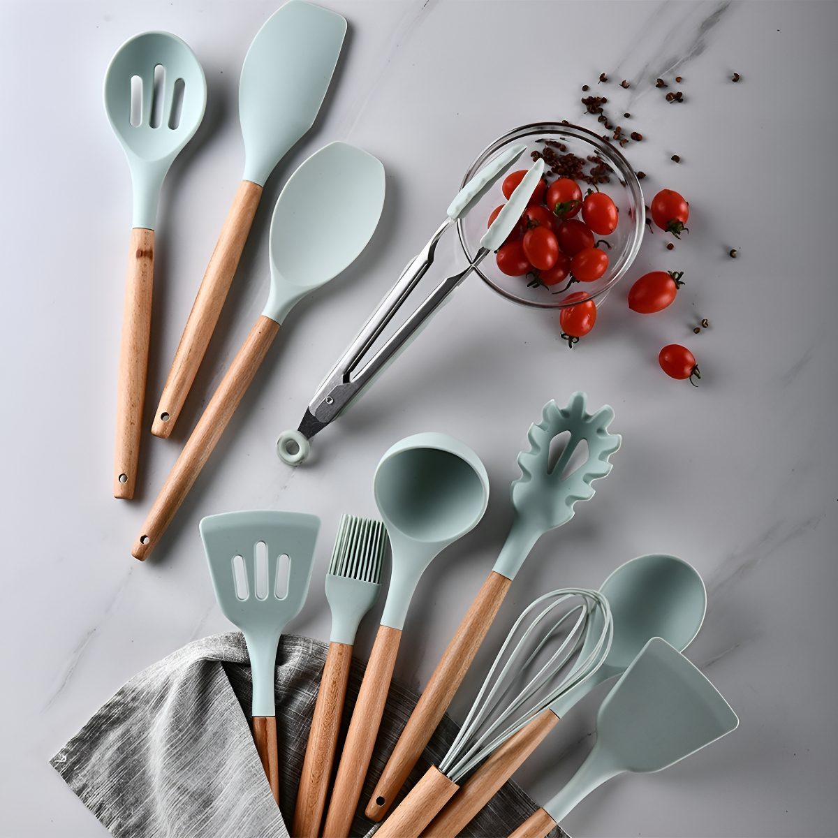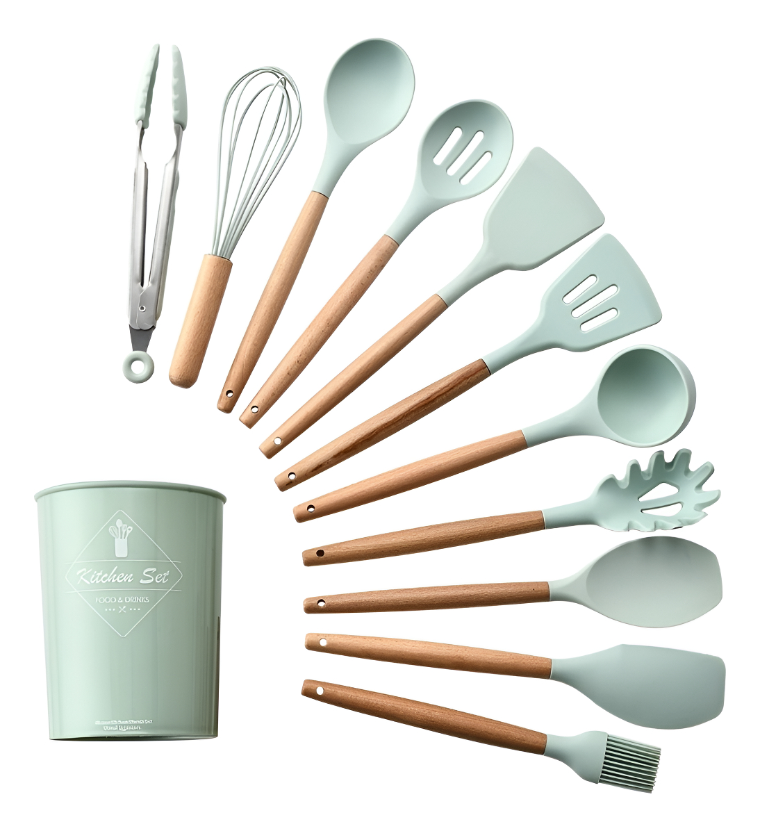 Elegí calidad y estilo para tu cocina. Con este completo set de 11 utensilios de silicona con mango de madera, vas a tener todo lo necesario para preparar tus recetas favoritas con comodidad y elegancia. Incluye un práctico soporte para mantenerlos siempre ordenados y al alcance de la mano.