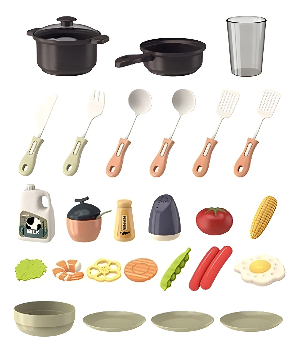 El set incluye 41 piezas y accesorios como tomate, huevo frito, choclo, cuchara, tenedor, olla, sartén, espátula, cucharón, cuchillo, salero, pimentero, vaso, entre otros. Además, incluye pilas AA y pegotines.