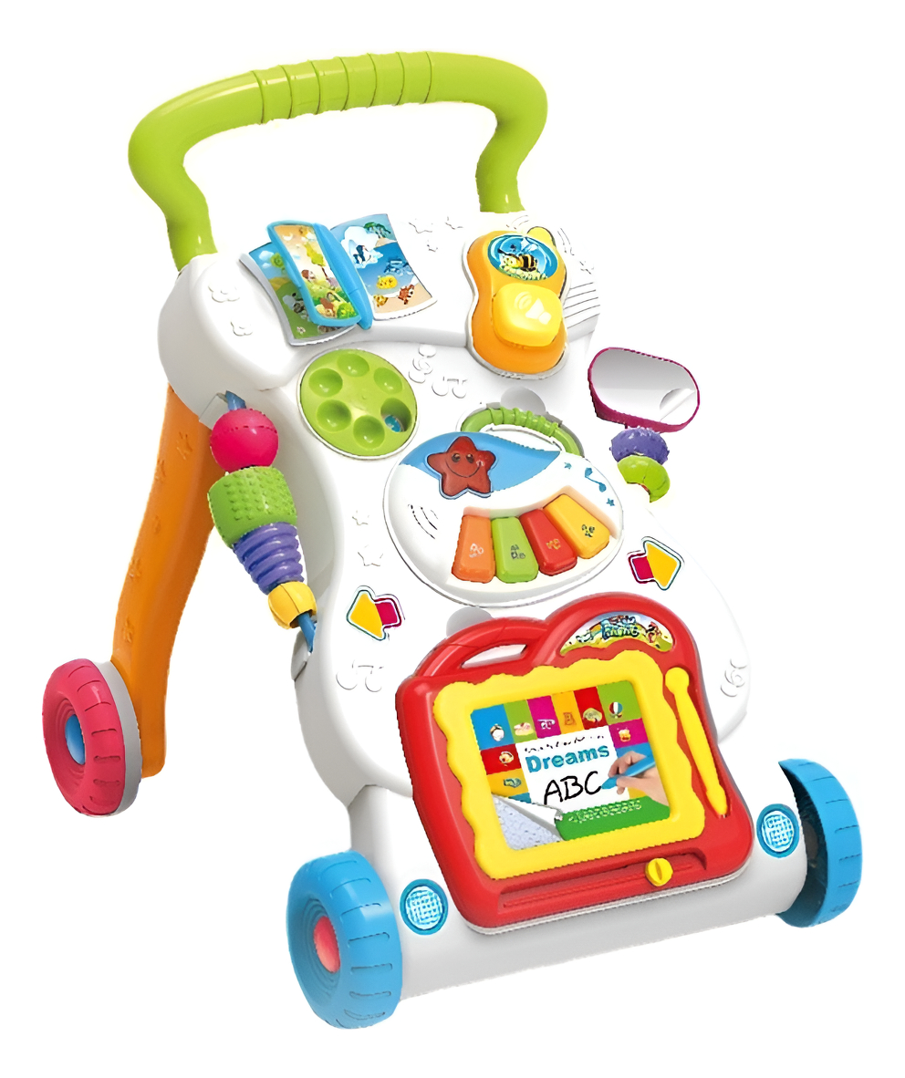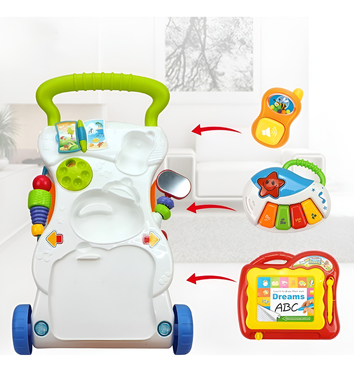 . Incluye: caminador, piano musical, tablero de dibujo, teléfono, libro y accesorios integrados.