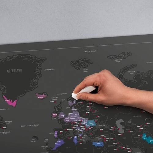 Cuando raspes sobre cada uno de los países que ya hayas visitado se mostrara en color purpura, turquesa, azul o rosa cada uno de ellos, destacando sobre el resto que mantendrá en color negro.