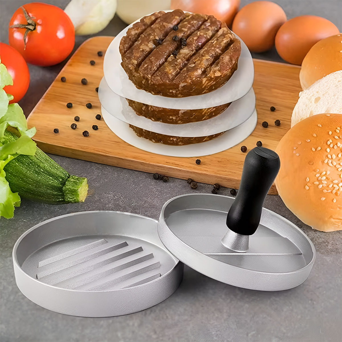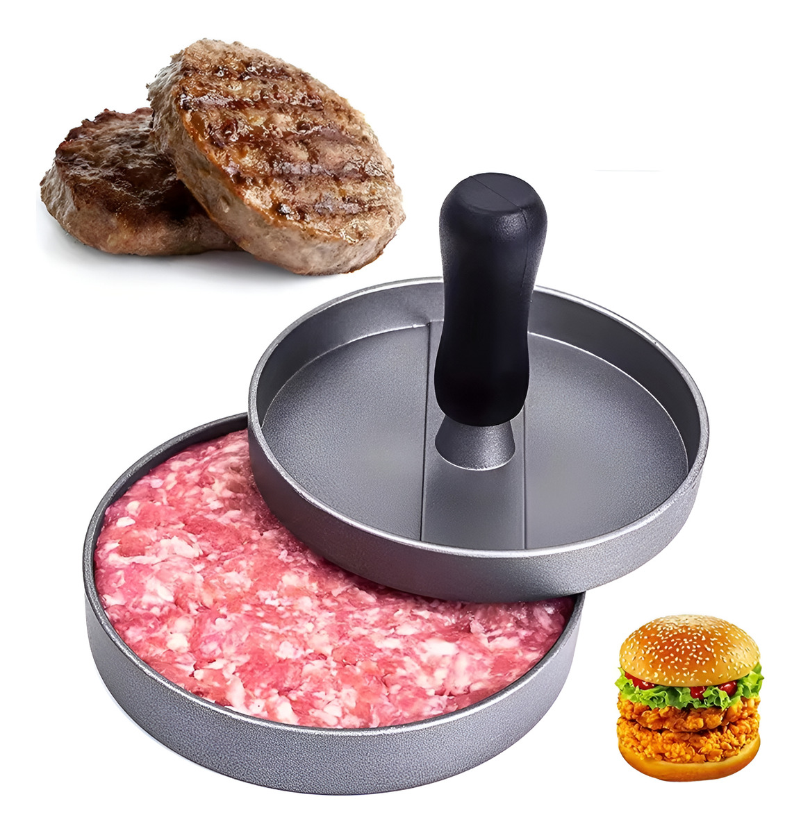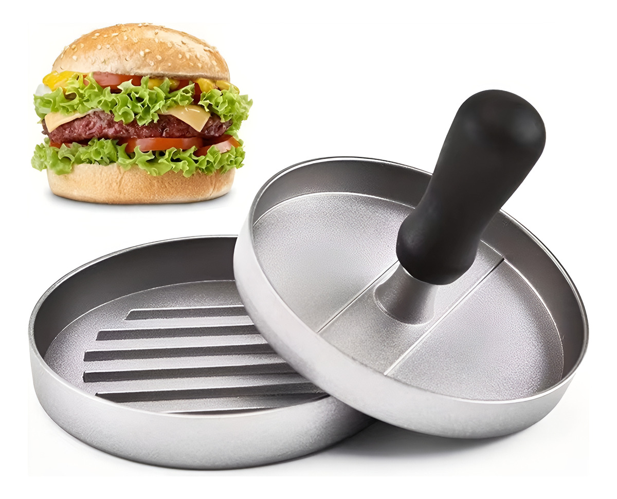 Prepará hamburguesas caseras perfectas con este molde individual de metal. Su prensa firme te ayuda a lograr medallones parejos y compactos en segundos, listos para la plancha, sartén o parrilla.