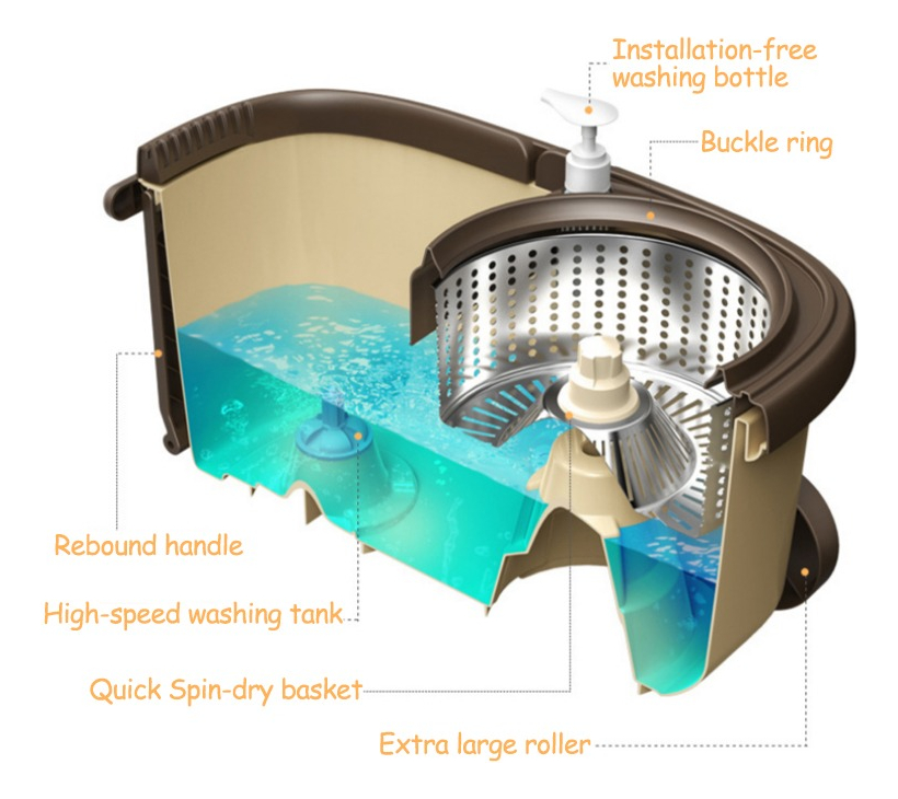 – Tipo: Mopa 360° + balde con centrifugador (lavado y secado en el mismo balde)