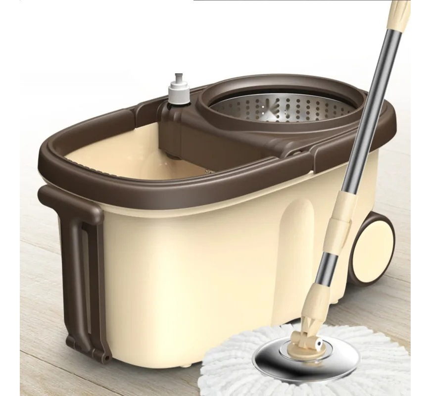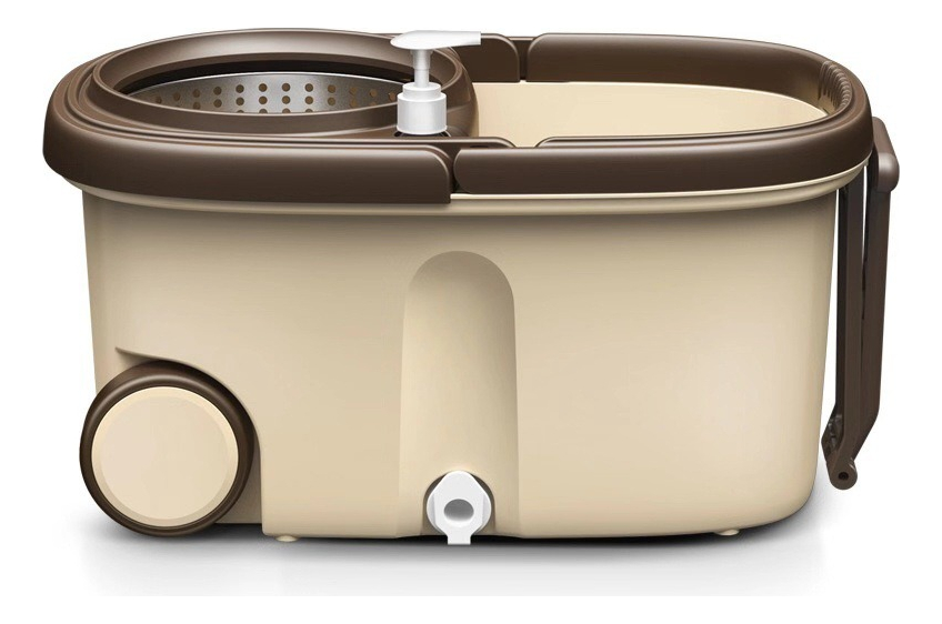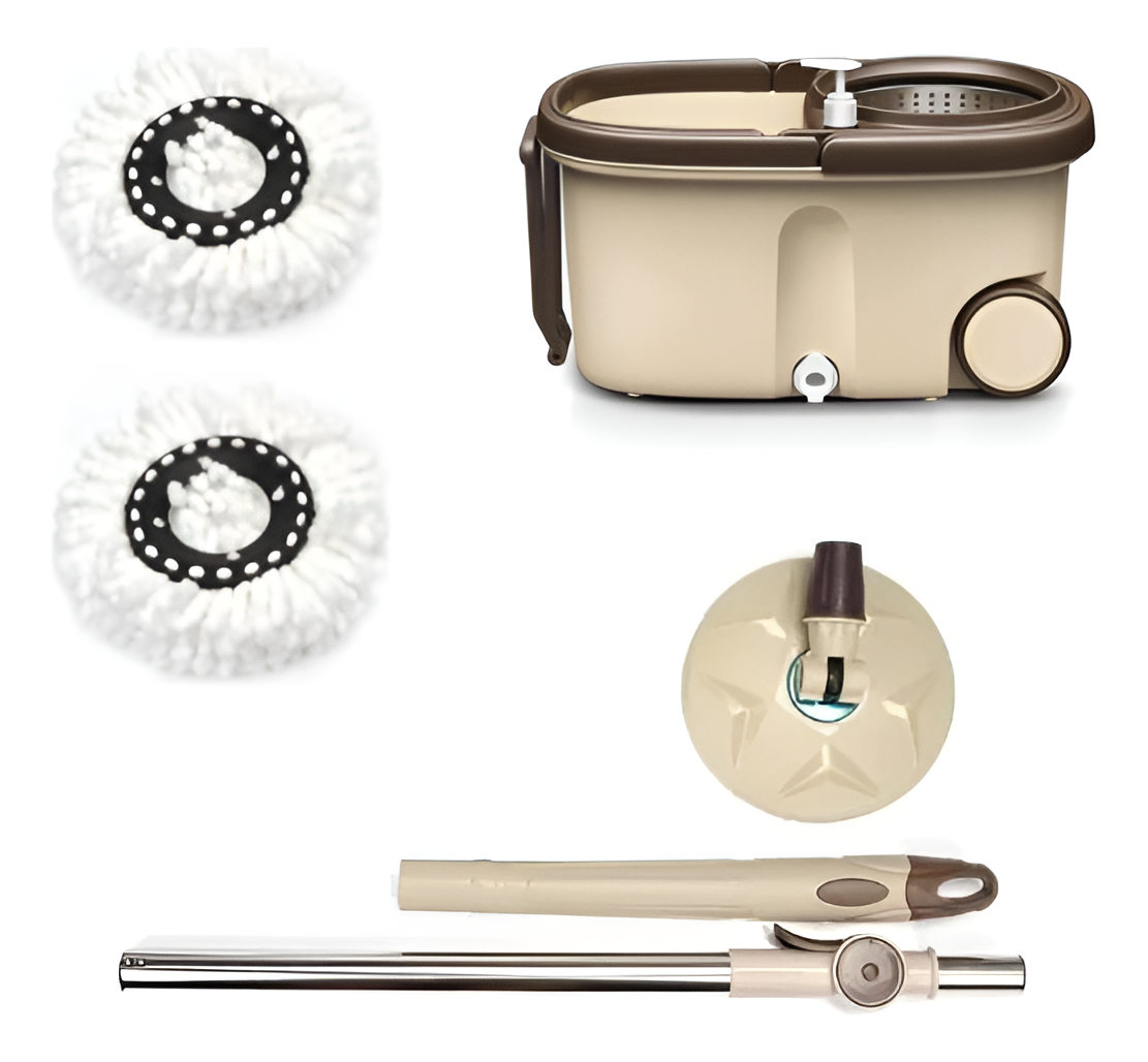 El balde incluye canasto centrífugo y cuenta con ruedas para moverlo con facilidad. Además, viene con 2 mopas, para que tengas repuesto y puedas usar una mientras lavás la otra.