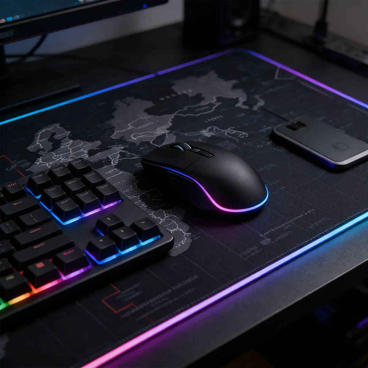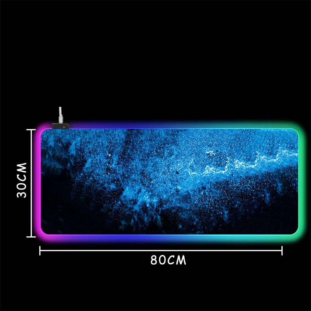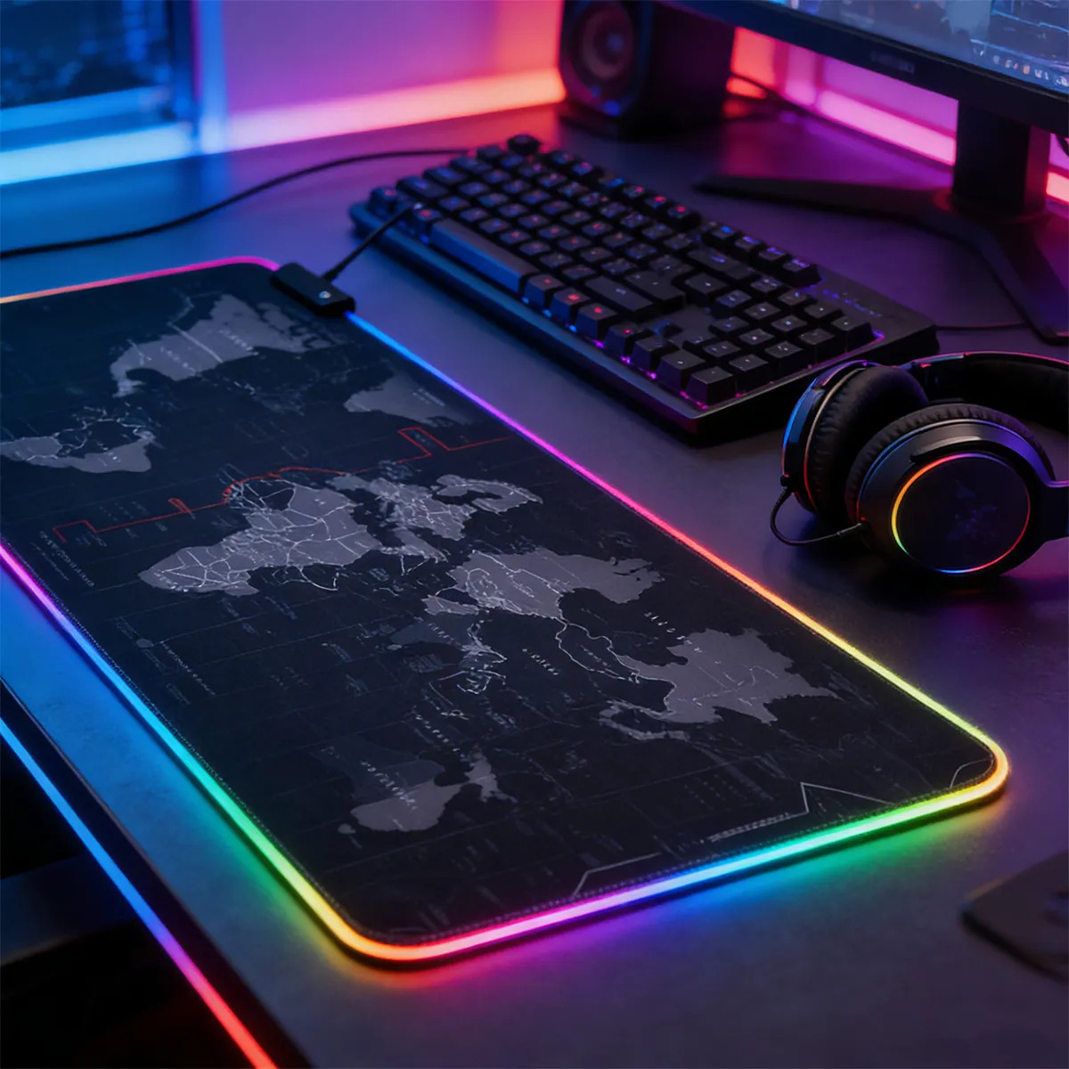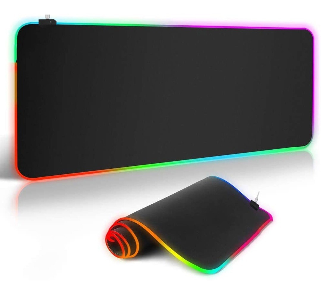Mouse Pad Alfombrilla Gamer RGB Led USB Grande, ideal para tu setup de gaming. Esta alfombrilla flexible y de gran tamaño cuenta con 14 modos de luces RGB para personalizar tu experiencia. Su superficie de microfibra suave está optimizada para velocidad y control, proporcionando una orientación precisa y un seguimiento de píxeles perfectos, ideal para todos los ratones. Además, cuenta con una base de goma antideslizante que asegura una sujeción firme sobre cualquier superficie. Material: Fibra y goma antideslizante.
