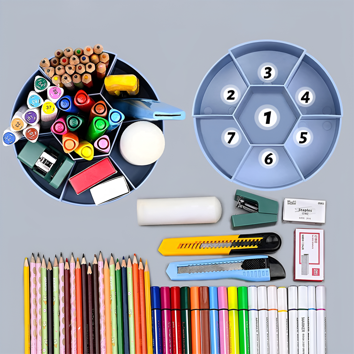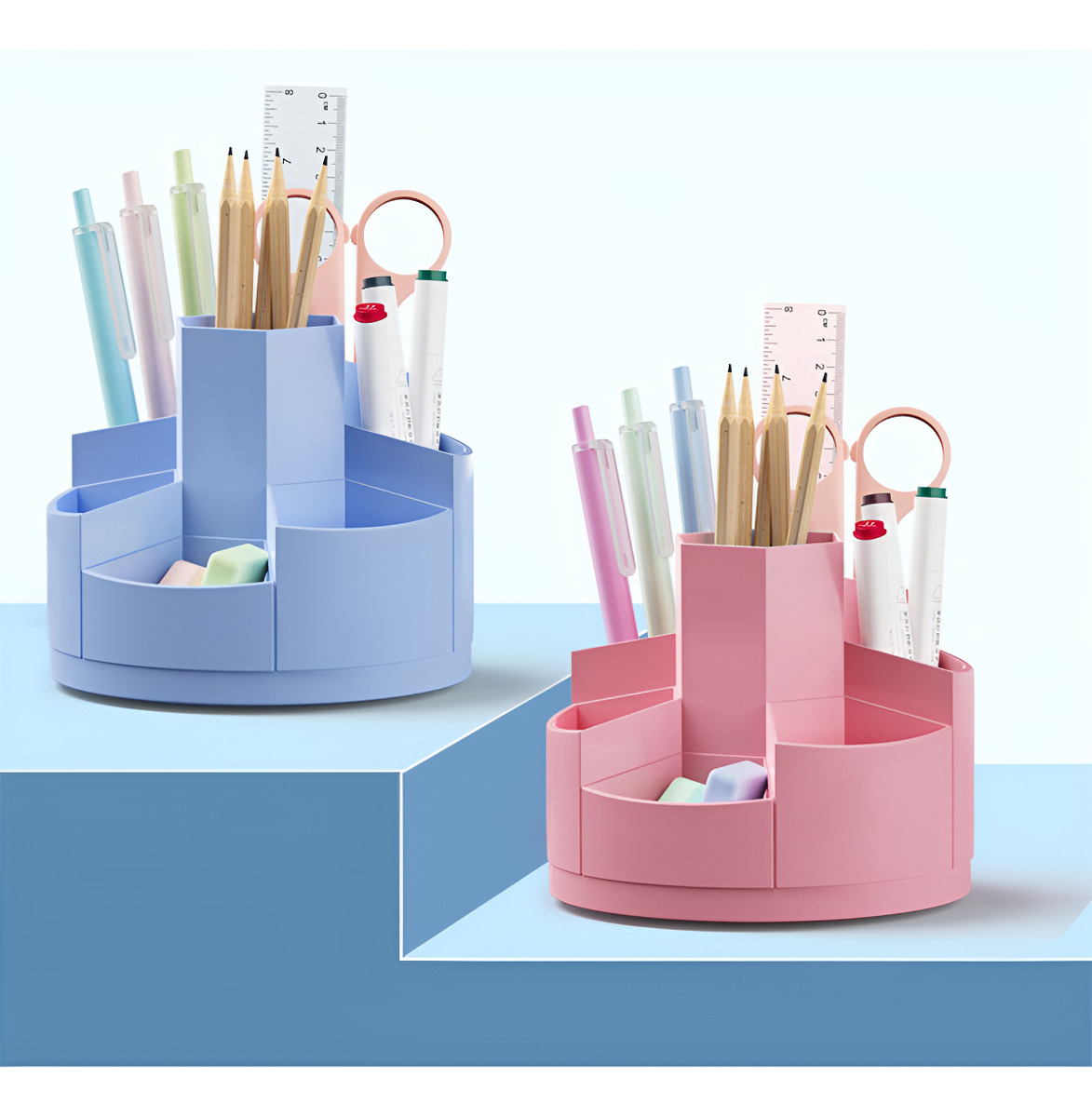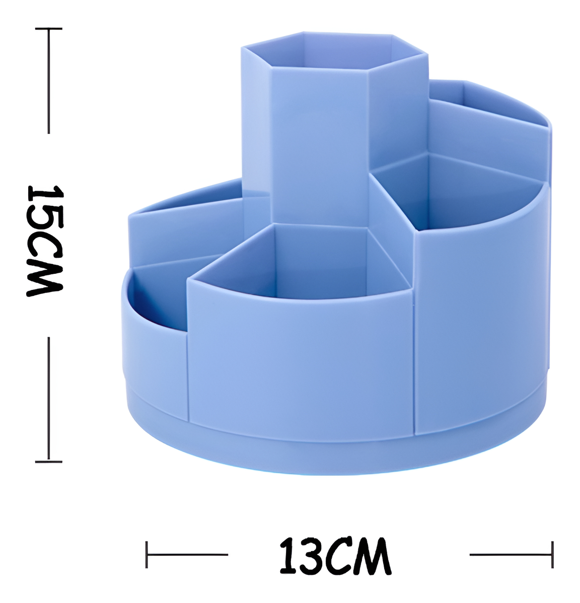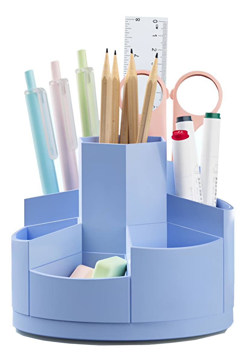 Poné orden en tu escritorio y encontrá todo al instante con este organizador giratorio 360° de gran capacidad. Mantiene lápices, lapiceras, marcadores, tijeras, reglas y clips siempre a mano, sin ocupar de más.