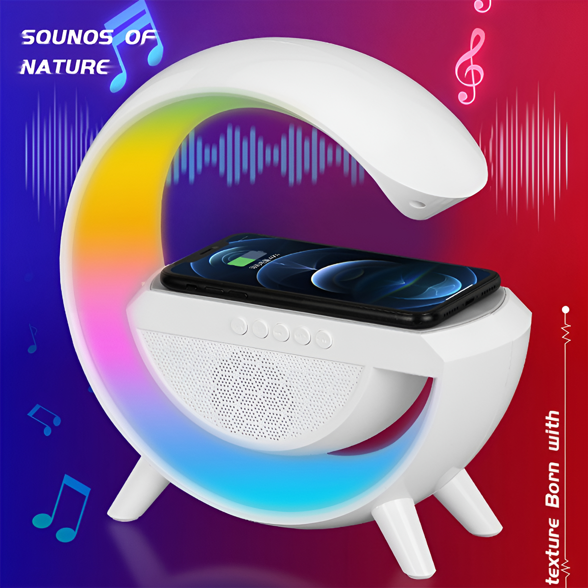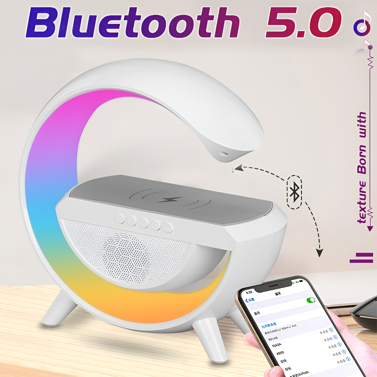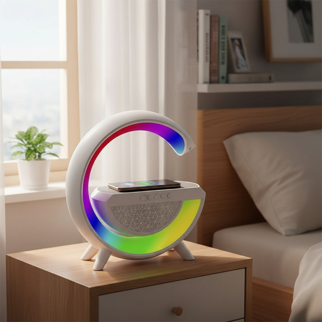 – 3 funciones en 1: parlante Bluetooth, veladora con luces LED RGB y cargador inalámbrico para celular.