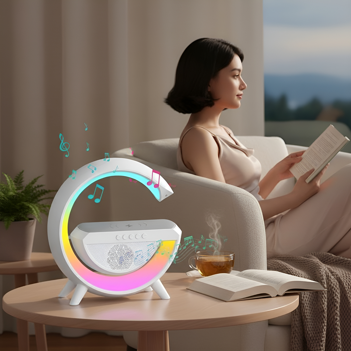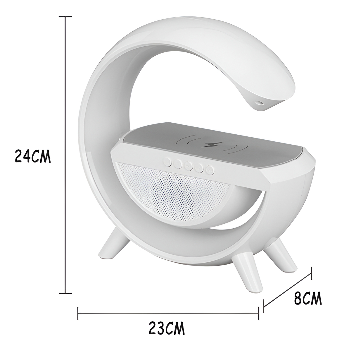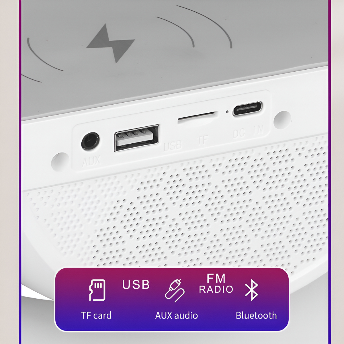 – 3 funciones en 1: parlante Bluetooth, veladora con luces LED RGB y cargador inalámbrico para celular.