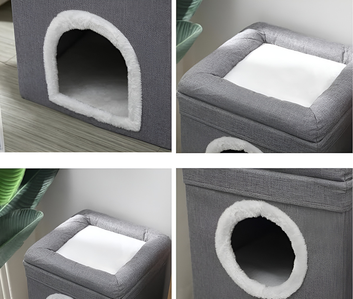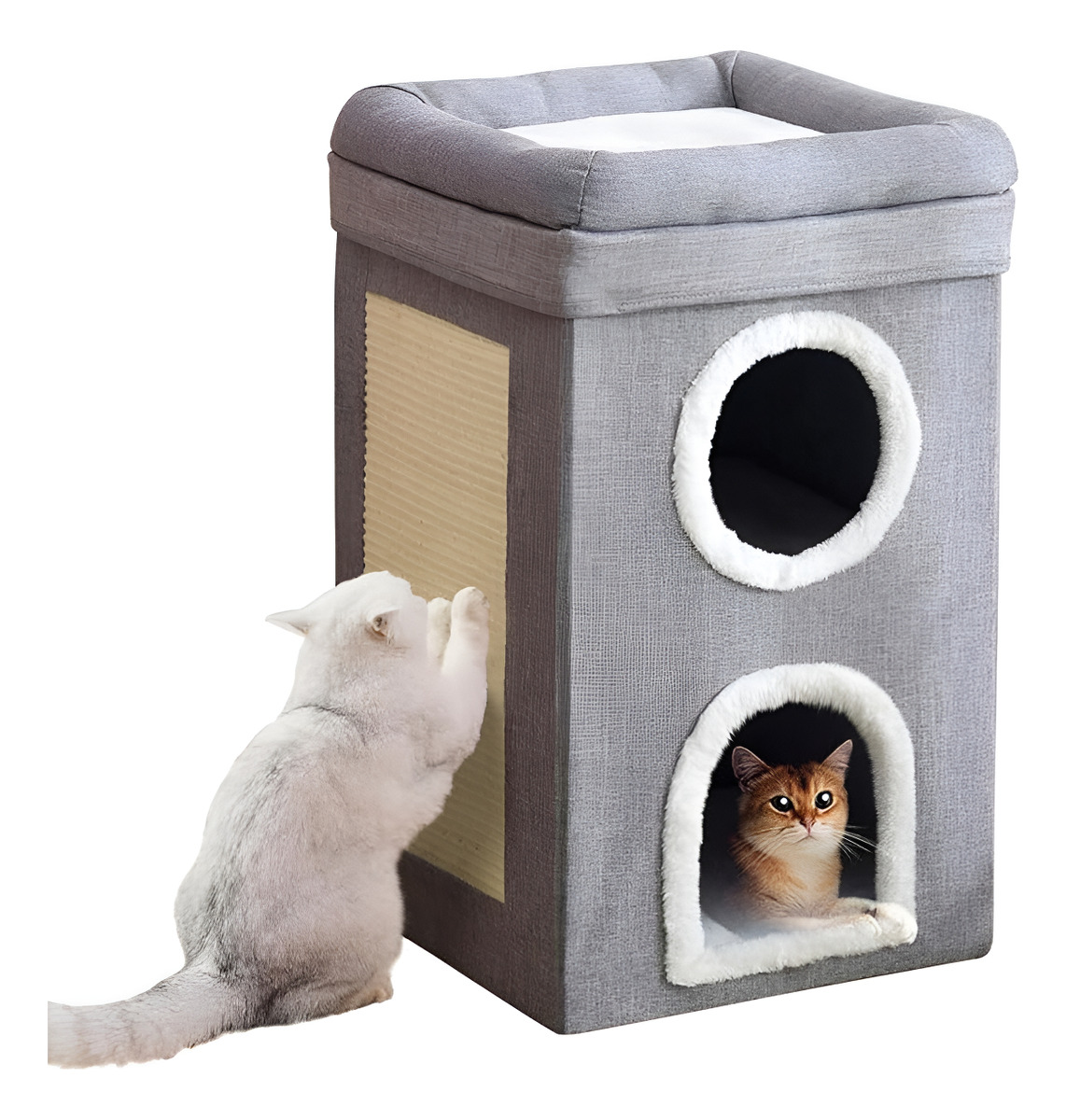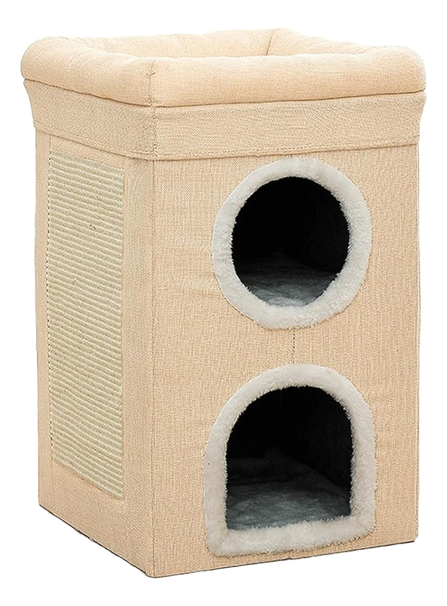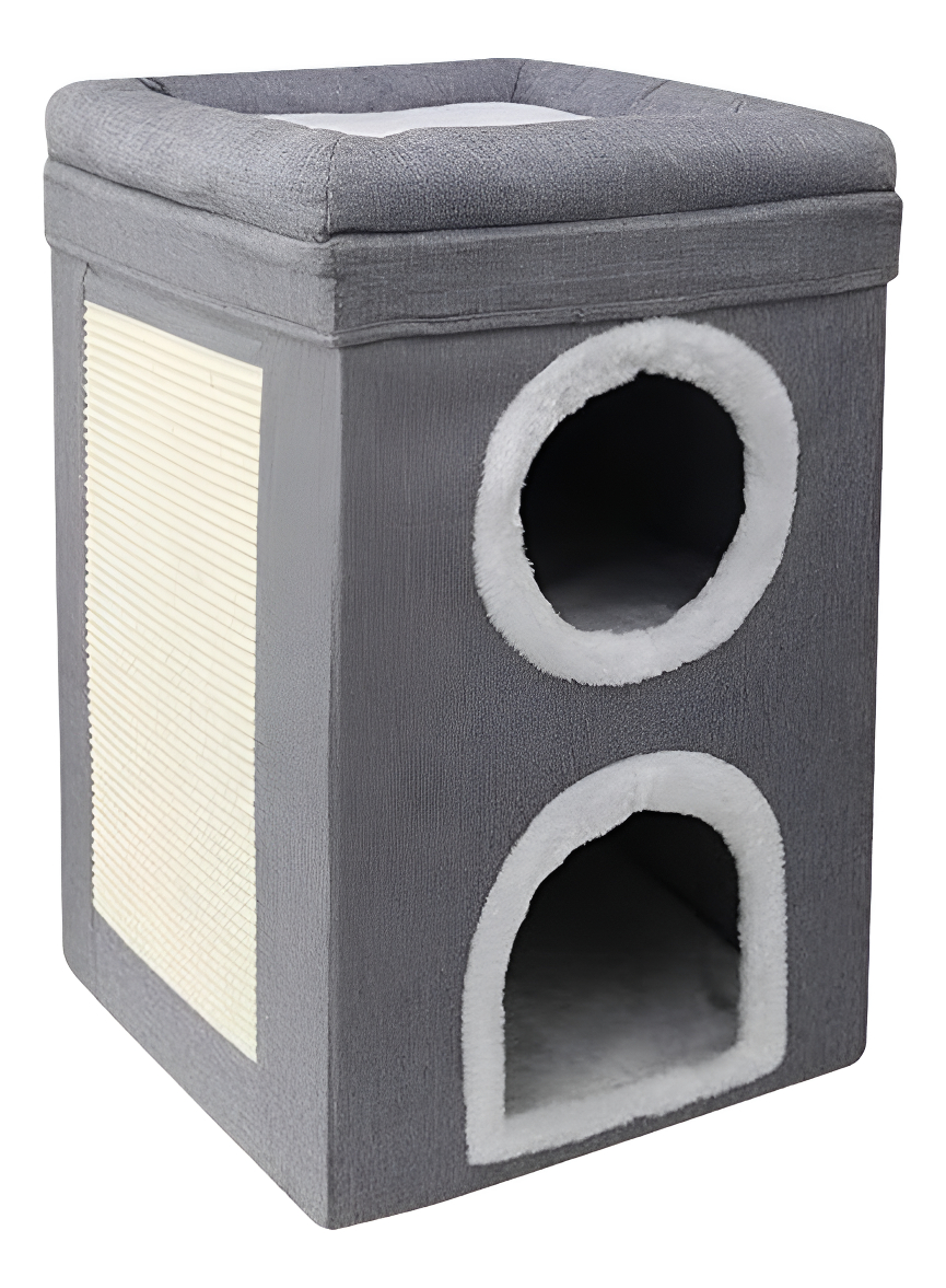 Esta torre rascador de 2 niveles ofrece una cueva inferior tipo refugio, un segundo nivel y una cama acolchada en la parte superior para vigilar con comodidad. El panel lateral de sisal satisface el instinto natural de rascado y ayuda a mantener sus uñas sanas, alejándolas del sillón.