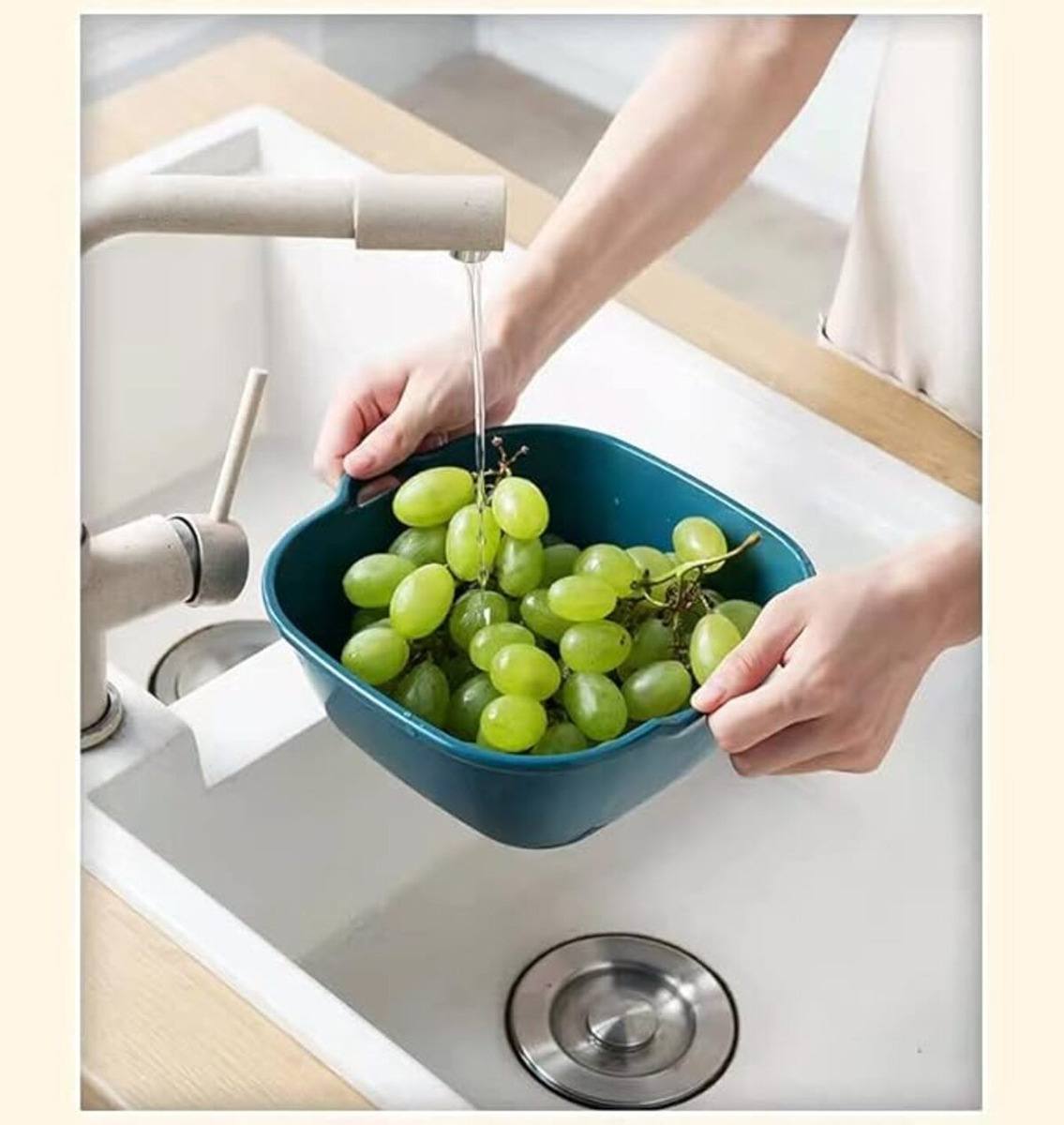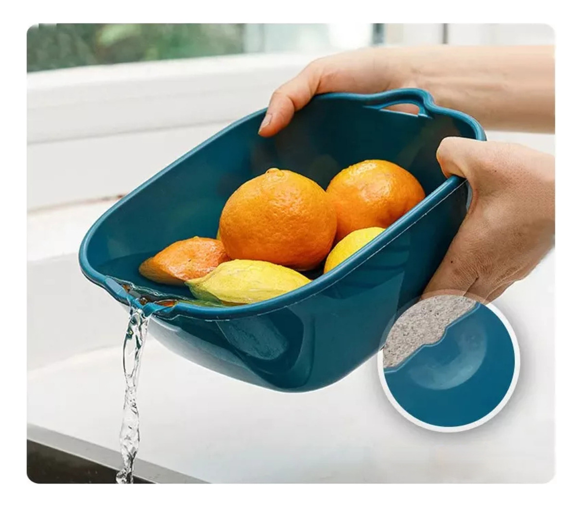 Este práctico recipiente está diseñado para facilitar tus tareas en la cocina. Cuenta con una abertura en uno de sus bordes que permite verter el agua fácilmente, ideal para lavar alimentos como frutas y verduras. Además, incluye un hueco que te permite colgar el producto para un almacenamiento más cómodo y eficiente.