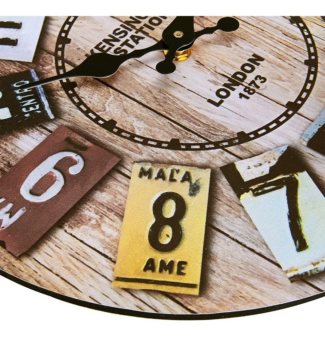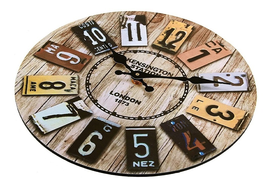 Dale un toque único a tus ambientes con este reloj de diseño vintage, inspirado en placas de autos antiguos y con acabado simil madera. Su estilo llamativo lo convierte en una pieza de decoración además de cumplir con su función práctica.