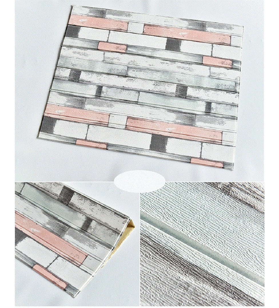 – Paneles Autodhesivos 3D Simil Listones de madera en tonos blancos rosados y grises.