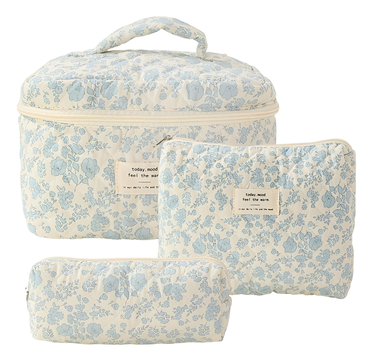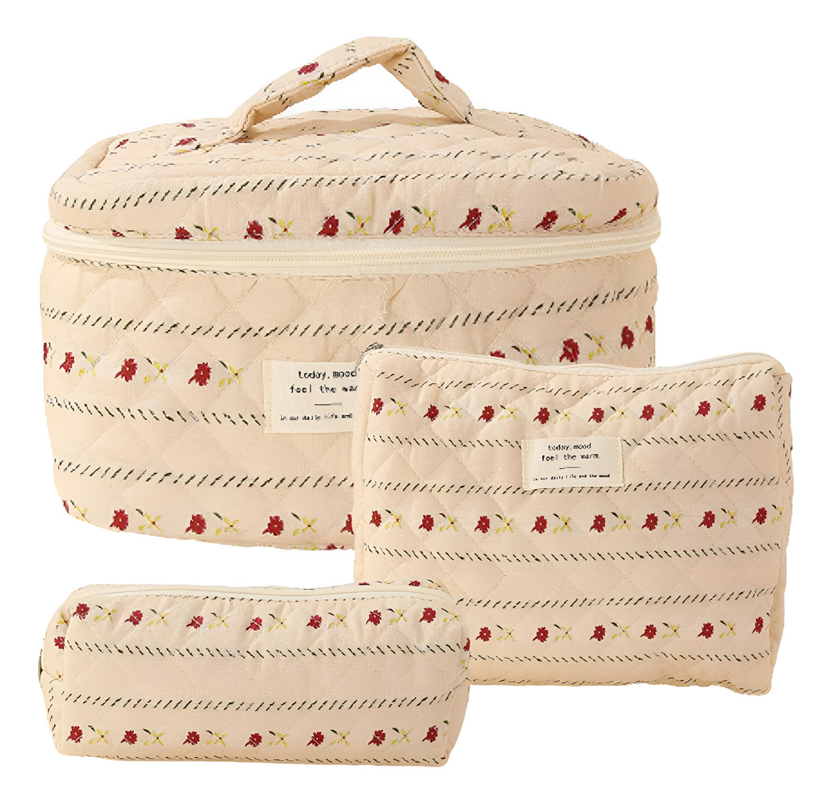 Perfecto para mantener tus productos de belleza siempre ordenados. Incluye un bolsito de mano con agarre, un neceser y una cartuchera, cada uno con un diseño práctico y compacto para diferentes usos.