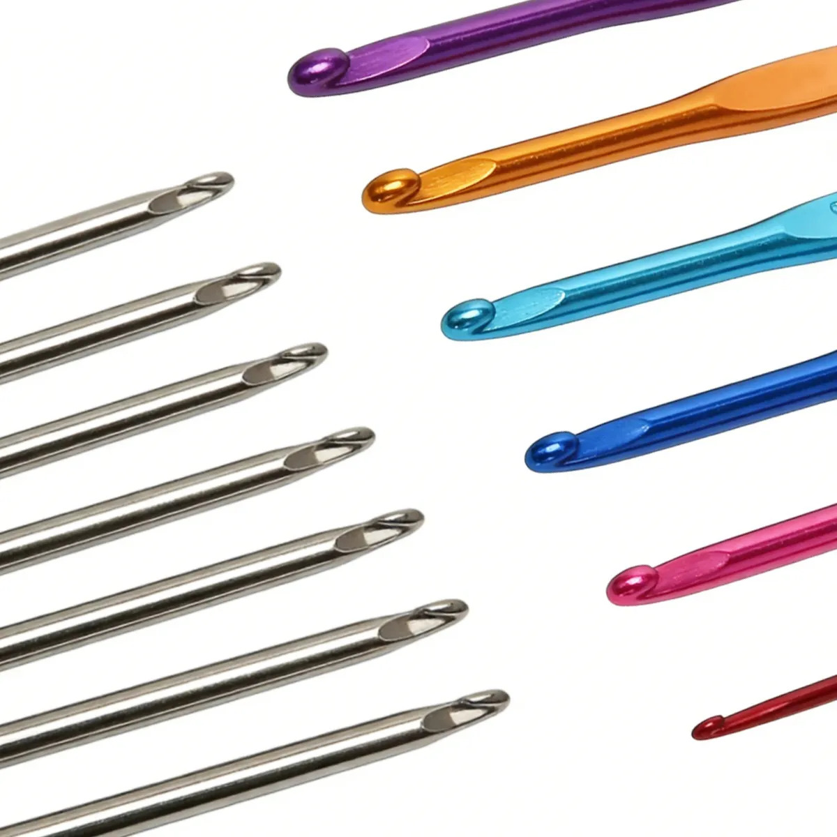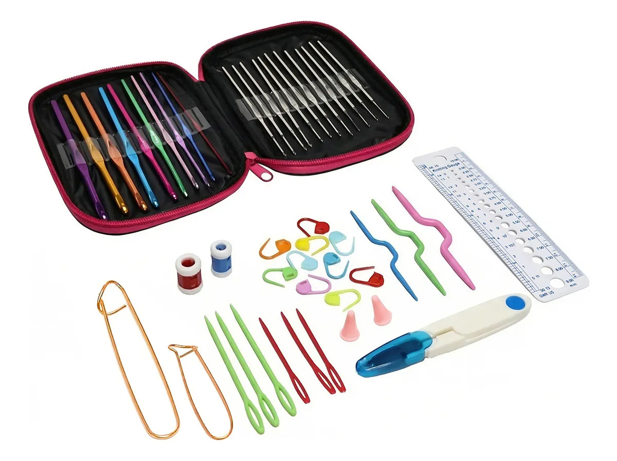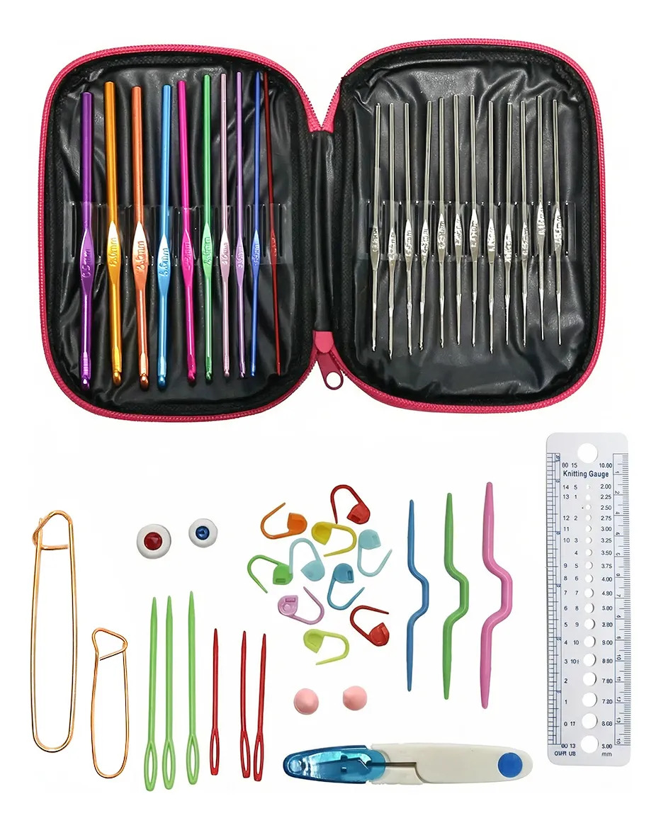 Todo lo que necesitas para tus proyectos de crochet está en este completo set. Incluye 22 agujas de diferentes tamaños, perfectas para cualquier tipo de tejido. Además, el estuche viene con una variedad de accesorios esenciales como regla, tijeras, agujas, contador de puntadas, y más. Todos los accesorios que ves en la foto de portada están incluidos. Ideal para principiantes y expertos. ¡Organiza tus herramientas y disfruta de tus creaciones con este set todo en uno!