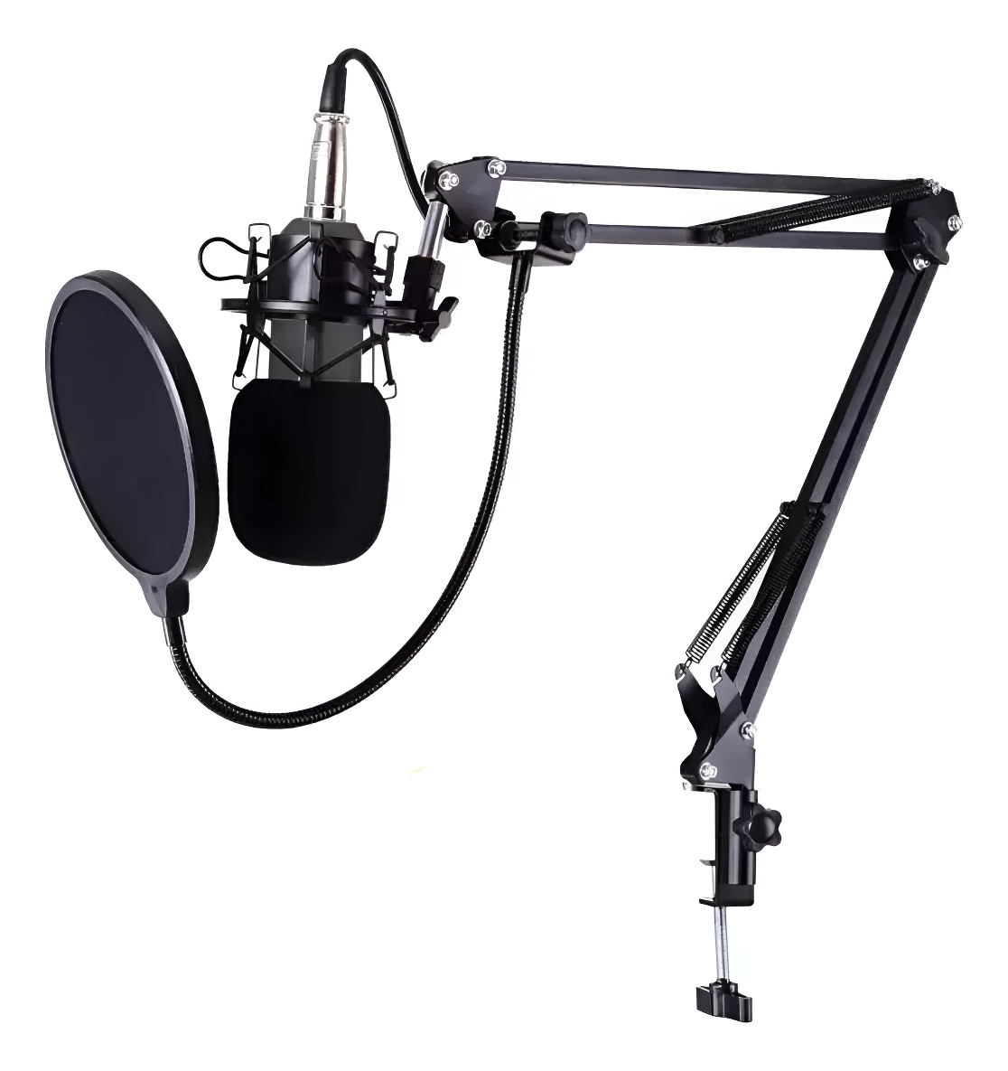 Set de micrófono que incluye: Mirófono Antipop para el micrófono (lo cubre) Filtro Antipop circular Brazo movible con prensa para escritorio Araña Cable Manual de instalación