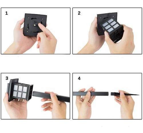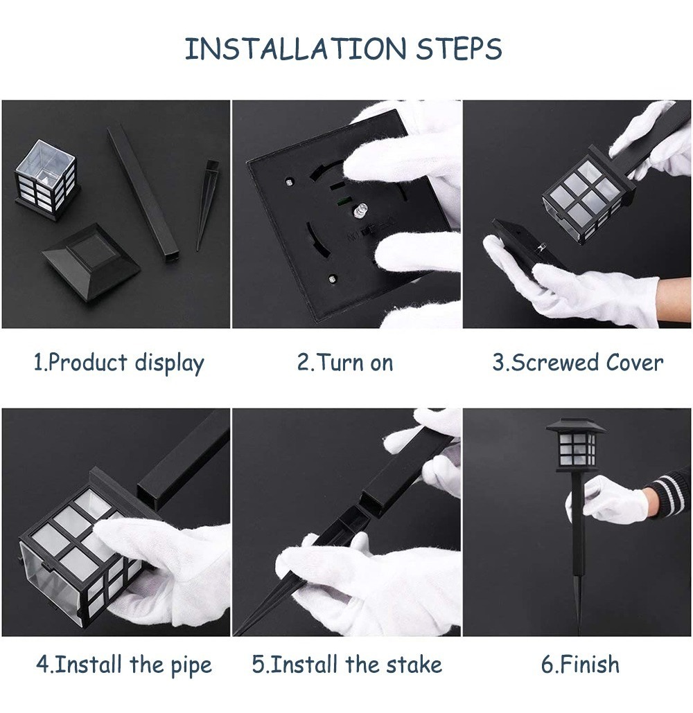 LUCES SOLARES: No se necesita cableado. Las luces LED se pueden instalar en dos minutos. Apague la tapa de la lámpara, encienda el interruptor de la lámpara, ensamble las piezas de acuerdo con las imágenes, finalmente insértelas en el suelo para completar la instalación.