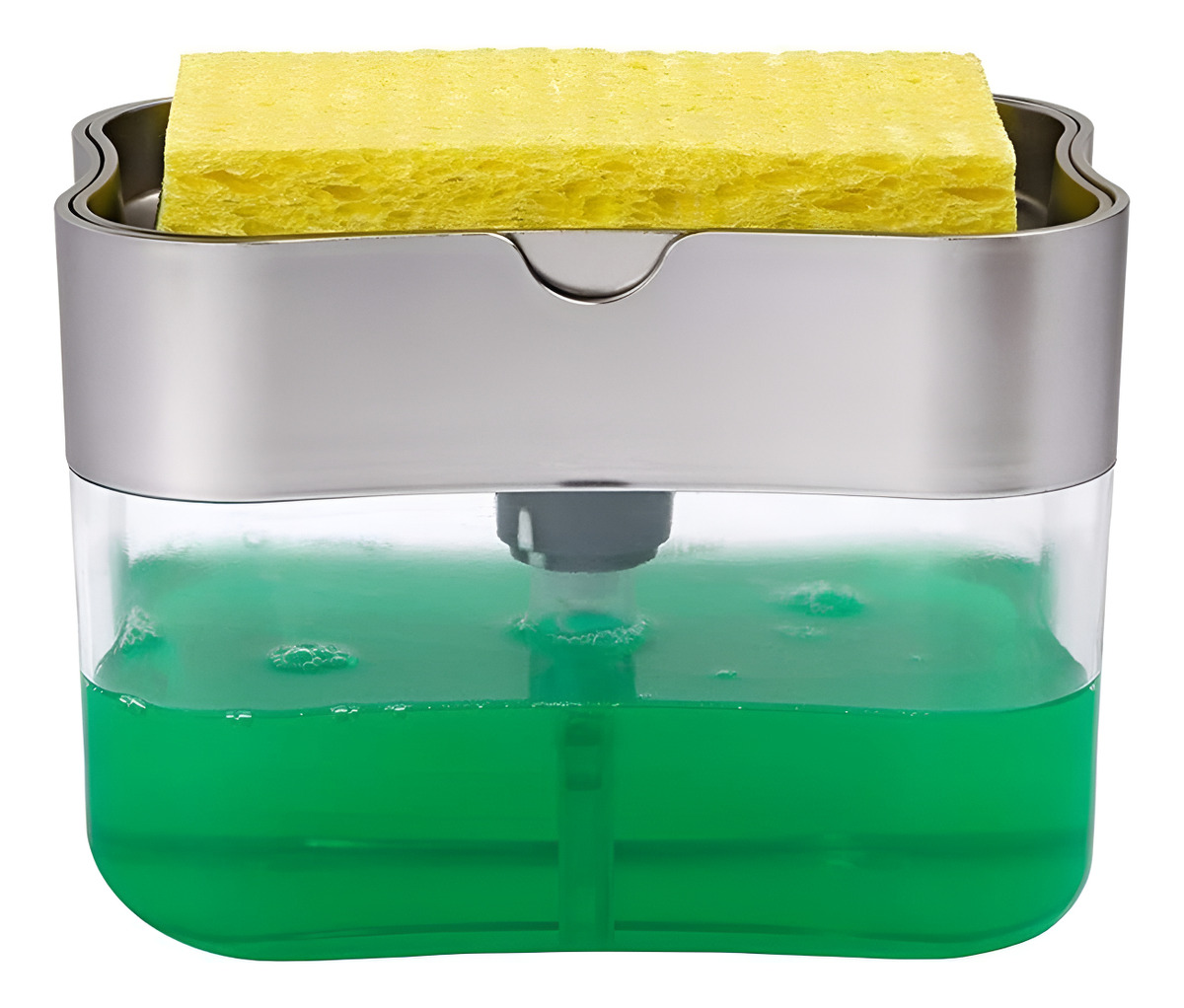 Su diseño 2 en 1 permite tener el jabón y la esponja en un solo lugar, lejos del fregadero y seco, listo para usar. Fabricado en material resistente, es duradero, anticorrosivo y apto para todo tipo de jabones líquidos.